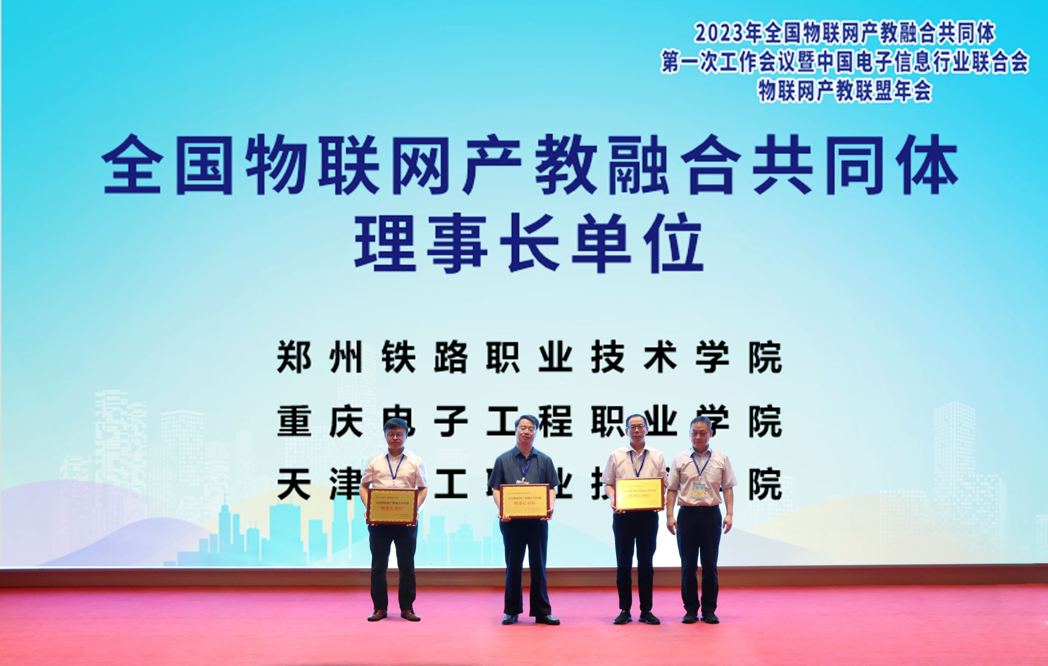 9月20日,2023年全国物联网产教融合共同体第一次工作会议暨中国电子信息行业联合会物联网产教联盟年会在福州召开。本次会议由全国物联网产教融合共同体、中国电子信息行业联合会物联网产教联盟及新大陆科技集团有限公司主办。重庆电子工程职业公司当选全国物联网产教融合共同体理事长单位,并牵头校企合作典型生产实践项目建设工作组,太阳成集团tyc234cc经理陈良代表公司接受授牌。