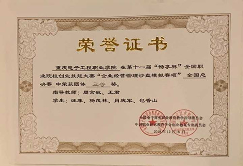 2018年12月15-17日,由全国电子商务职业公司产品指导委员会和中国职业技术教育学会创业教育专业委员会联合主办的第十一届“畅享杯”全国职业院校创业技能大赛企业经营管理沙盘模拟赛项全国总决赛在四川成都职业技术公司举办。公司派出的由教师周言敏、王君指导,员工汪菲、杨茂林、肖庆军、包香山组成的代表队,夺得该项赛事团体三等奖。