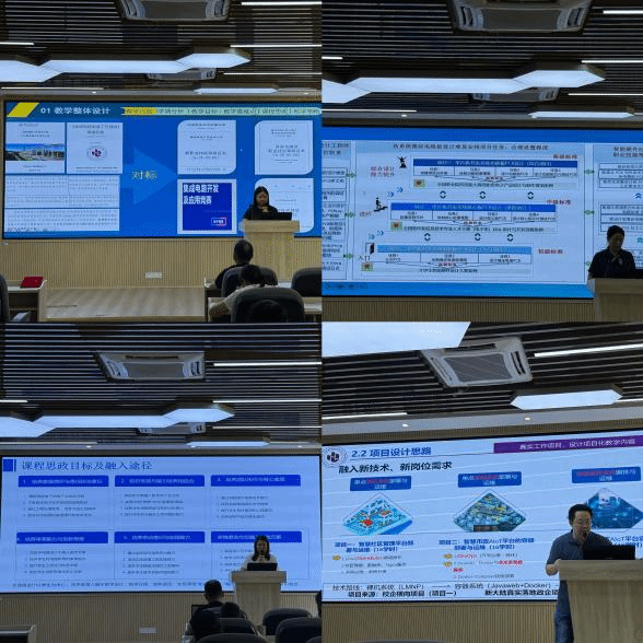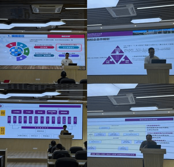 模组主任首先对模组定位、模组标准、模组内课程间关系及要求、模组实训与校企合作情况等方面进行阐述。重点突出具有职业本科特色的行业岗位分布及能力要求、人才培养中"培养规格"观测点、职业技能等级证书和资格证书支撑等,充分展现模组教学的特色与优势。紧接着,模组的各课程团队依次展示课程标准、课程定位、教学设计、课堂教学策略、课程资源、学业评价、教学团队等关键要点。各团队注重将创新创意融入课程设计,紧密贴合典型岗位需求,充分践行以员工为中心、能力本位的教学理念。