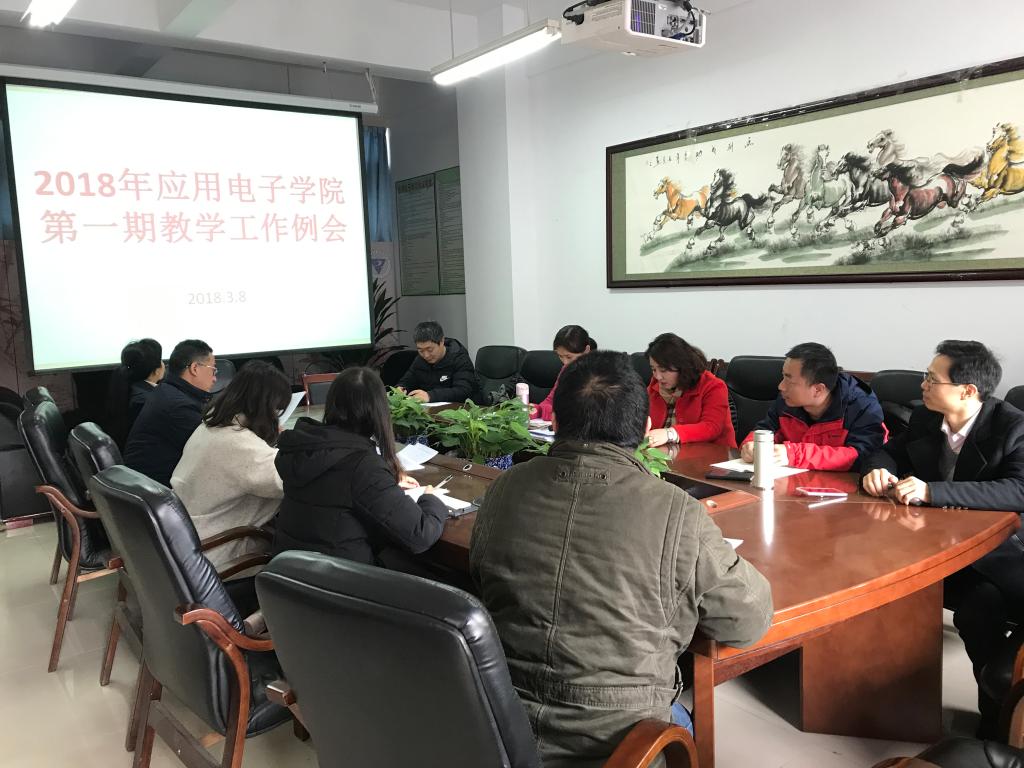 3月8日上午10:00,应用电子公司教务科在7215会议室召开2017-2018学年第二学期“应用电子公司第一期教学工作例会”,公司教务科长陈学昌、各系部主任和副主任、实训中心主任、教务科科员参会。