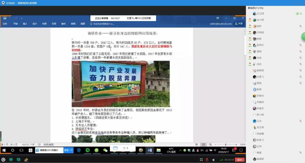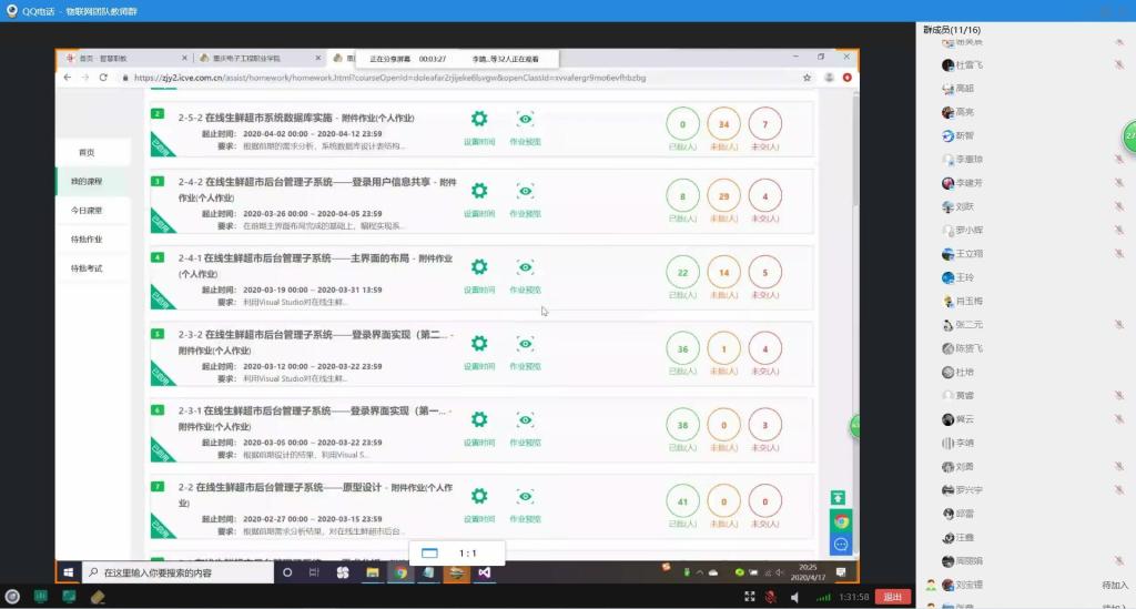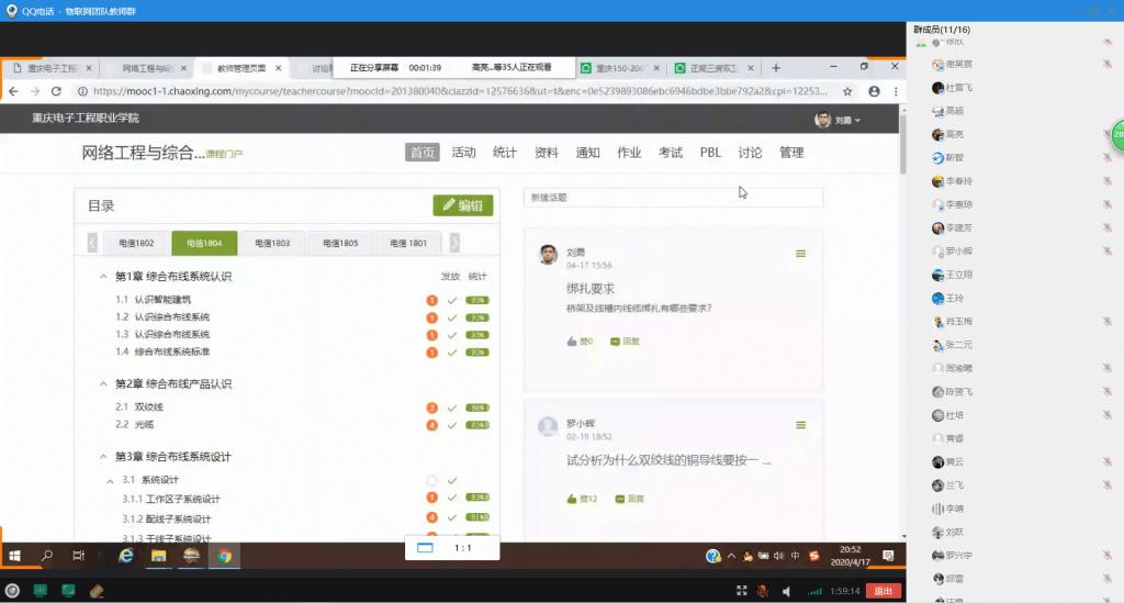 4月17日星期五晚19:00-21:30,为更好地对近半学期来团队教师开展线上教学所取得的经验进行交流和总结,信息工程系与物联网应用系通过QQ群视频方式,围绕在线教学的课程设计、教学实施、教学效果与反馈、教学反思、线上教学平台及教学工具选用等多方面开展阶段性研讨与分享交流活动。交流活动由信息工程系主任徐小辉博士主持,与会老师结合自己半学期来的相关教学实践和过程总结进行积极发言分享。