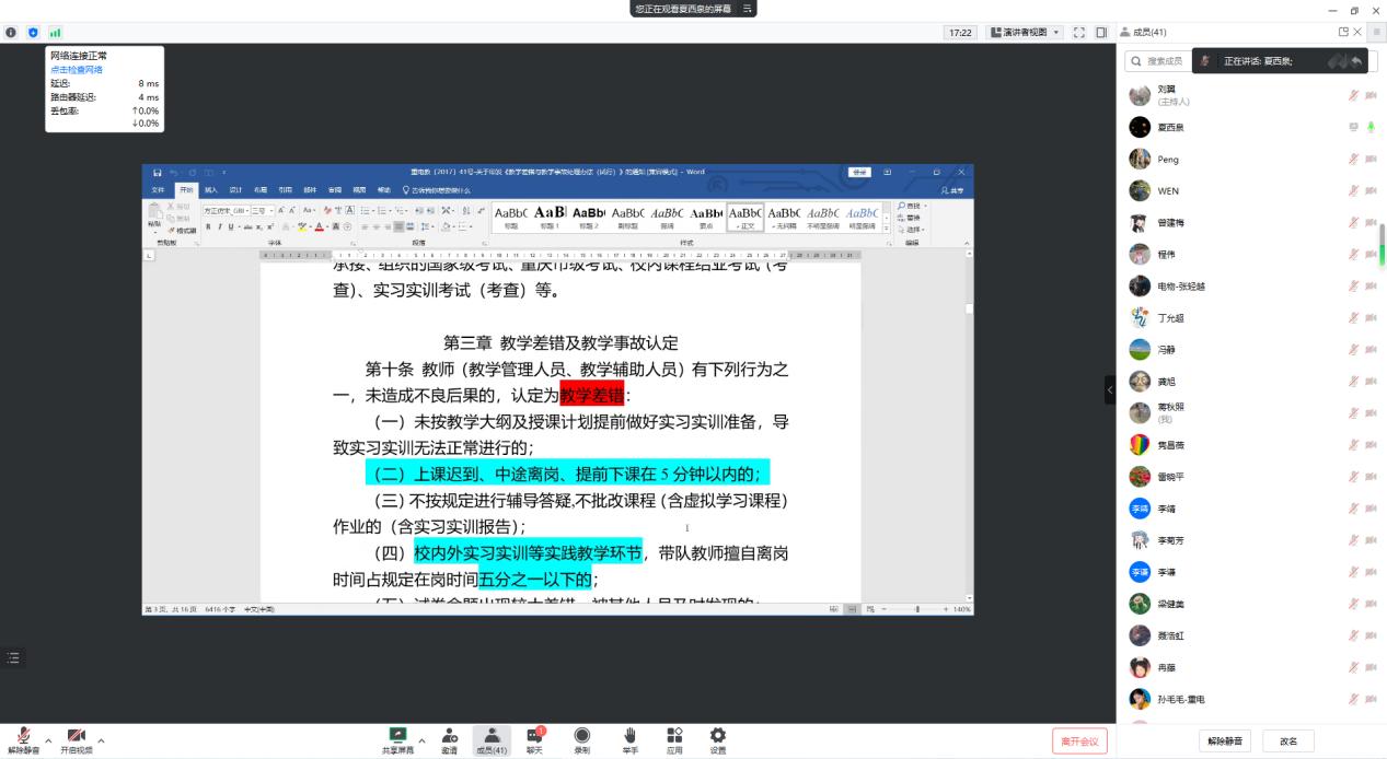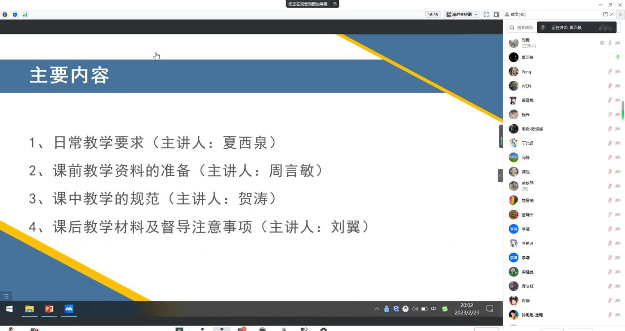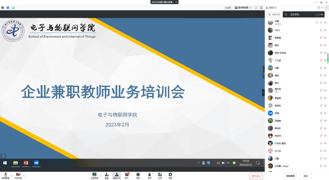 为进一步规范企业兼职教师教学行为,加强企业兼职教师教学管理工作,提高外聘教师教学质量,太阳成集团tyc234cc于2月23日通过线上方式组织召开“2023年春季企业兼职教师业务培训会”。公司夏西泉副经理、刘翼科长、各系主任、教学秘书、校内一对一指导教师及全体企业兼职教师参会。