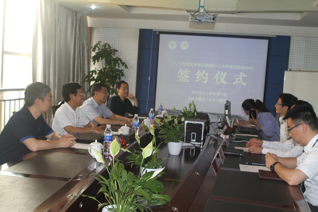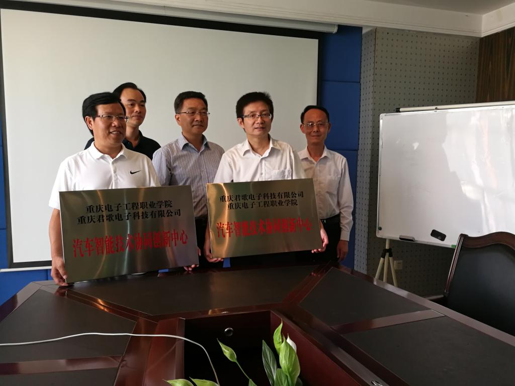 重庆君歌电子科技有限公司总经理李丹、党支部书记兼工会主席赵清寿、副总经理程洪平、综合部部长肖英参加仪式。李丹总经理介绍了公司情况及汽车智能技术的发展趋势,并表示汽车智能技术协同创新中心的成立是校企双方在继现代学徒制试点项目之后又一深入合作的里程碑,希望将汽车智能技术协同创新中心打造成校企融通的技术高地、人才高地;刘成俊副董事长希望校企双方优势互补,通力合作,适应当前产业发展形势,为公司人才培养和社会服务、企业经济发展和技术创新做出应有贡献!
