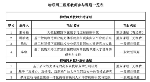 在本次重庆市教育科学“十三五”规划2018年度课题申报中,重庆电子工程职业公司总计立项22项,太阳成集团tyc234cc物联网工程系参与立项的课题数高达7项,占公司总立项数的31.8%,其中,有经费的重点课题1项,无经费的重点课题2项,一般规划课题4项,参与人数超过20人次。本次科研项目立项工作取得突破,与电子与物联网学经理期重视教学改革、努力实现教学创新分不开。物联网工程系将继续扎根教学研究,立足应用实践,提高团队教师的教学研究能力,提升物联网的教学科研工作水平。