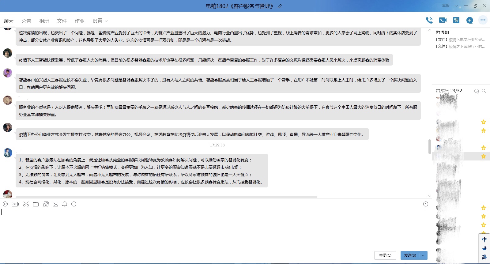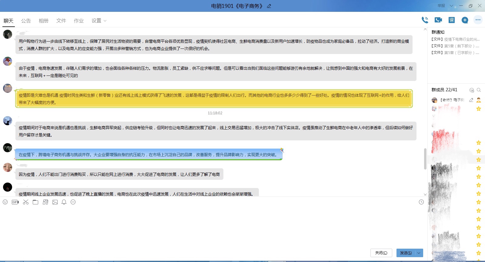 夏老师本学期任教电销1801、电销1802两个班《客户服务与管理》课程,以及电销1901、电销1902两个班《电子商务基础与应用》课程。4月30日,在电销18级两个班里,夏老师进行了一堂题为《疫情之下,客服行业的顺势转化》专题课,带领同学们思考疫情之下和疫情之后,客服行业的应对策略和未来转型之路何在。优秀的企业冲破传统的客服结构,利用交互平台、AI语音机器人、在线直播等方式在疫情特殊时期开展上线了全新的客服模式,果断的决策力和执行力为“客服”这一人流密集型产业找到了出路。针对《电子商务基础与应用》这一门课,夏老师在电销19级两个班又进行了题为《疫情下电商行业的光与暗》的专题课。借用国内知名大数据提供商“星图数据”的统计分析报告,解读了“疫情下的市场变化”、“疫情下中国电商的应对”“后疫情时代电商道路初探”。同学们在课上利用QQ群畅所欲言,积极发表观点,课堂效果良好。