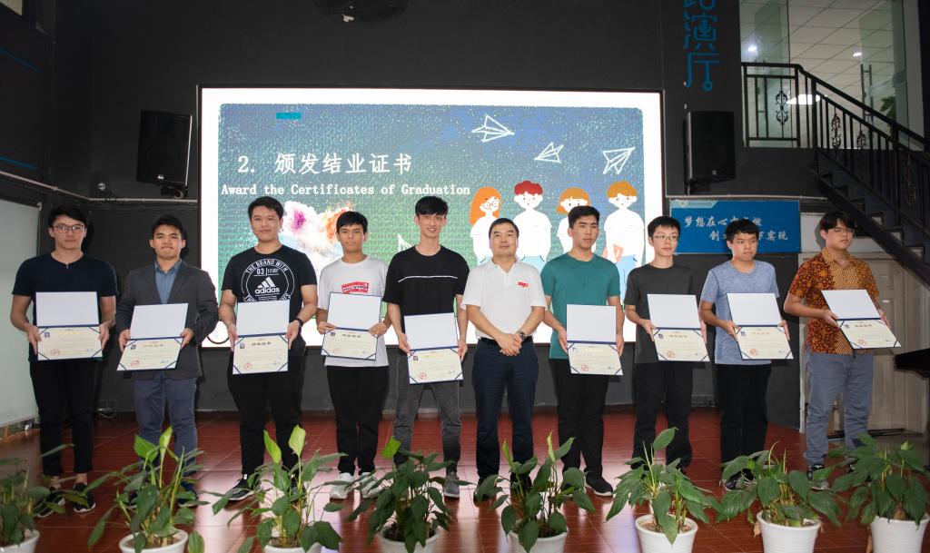 2019年6月21日下午3:00,新加坡职工结业典礼暨文艺汇演在众创空间路演大厅举行。公司董事长聂强、党委副书记唐玉林、副董事长刘成俊,国际交流与合作发展处副处长刘影,公司党总支书记张红斌、经理陈良、副书记毛弋、副经理夏西泉,公司学管科负责人张力、辅导员刘琴,新加坡工艺教育局中区公司电子学高级讲师李文亮、通讯科技高级讲师巩铭、18名职工,公司志愿者和部分员工参加了结业典礼。