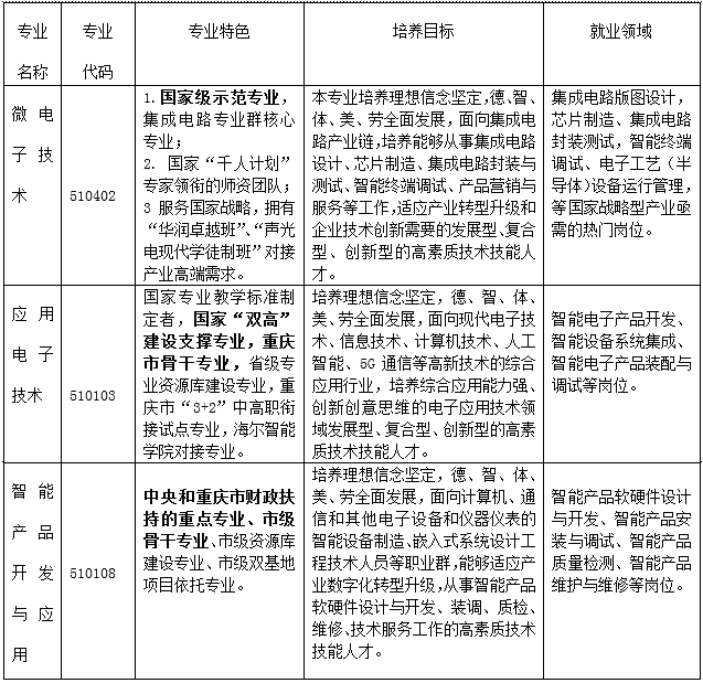 集成电路专业群包括微电子技术、应用电子技术、智能产品开发与应用等三个专业,具体专业简介如下:
