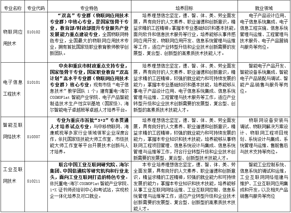 毕业生就业质量高,毕业生大多就职于华为、中移物联网、重庆信息通信研究院等行业领军企业及生态企业;近3年专升本上线比率逐年提升,2020年专升本上线率达到68.8%;部分优秀毕业生在毕业两年后升入重大、重邮、重师等本科院校读研。物联网应用技术专业群包括物联网应用技术、电子信息工程技术、智能互联网络技术、工业互联网技术等四个专业,具体专业简介如下: