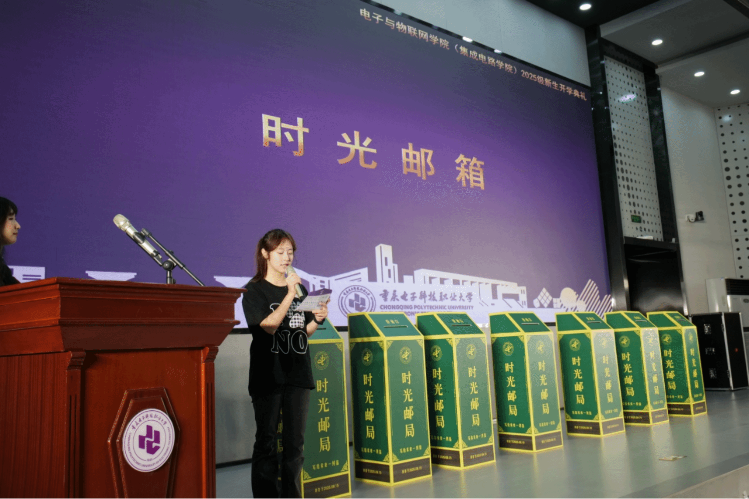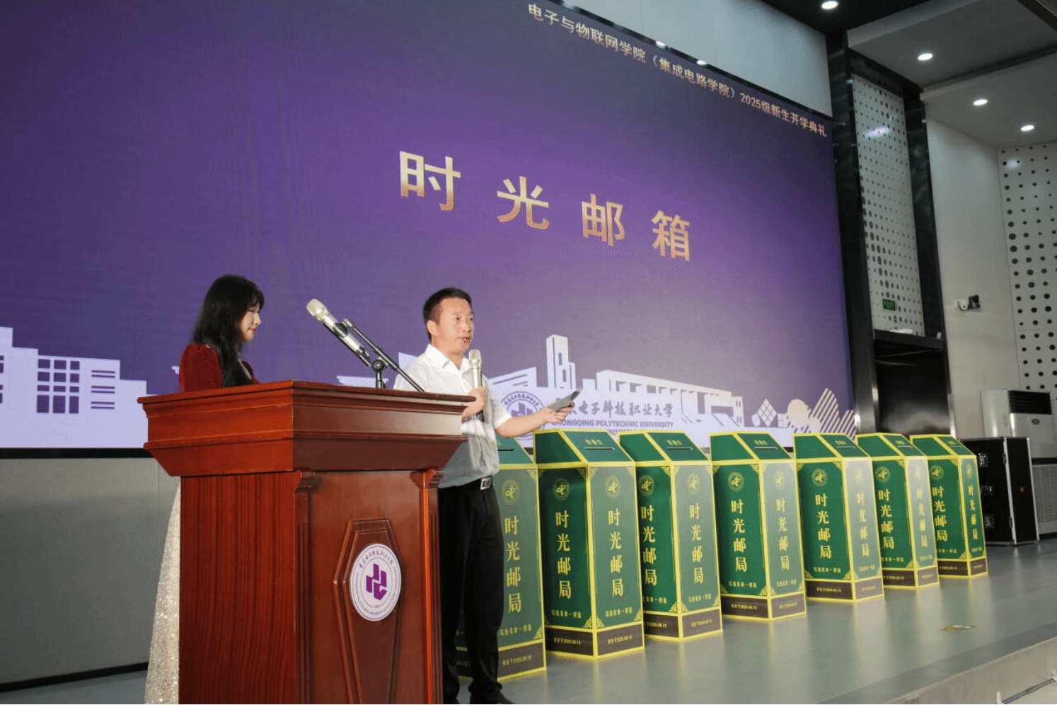 伴随着典礼进入末声,“时光邮箱”环节温情开启。2025级新生们提前写下对未来的愿望与期待——或许是学业目标,或许是成长期许,或许是对未来自己的叮嘱。大家将写满心愿的信件投入“时光邮箱”,公司统一封存保管,约定在毕业时共同开启,见证四年的成长与蜕变。与此同时,黄爱明副董事长也送上真挚寄语——“未来已来,欢迎你来!身体倍棒,天天开心;勤奋好学,示范为尚”。这一充满仪式感的环节,为开学典礼画上了圆满句号。