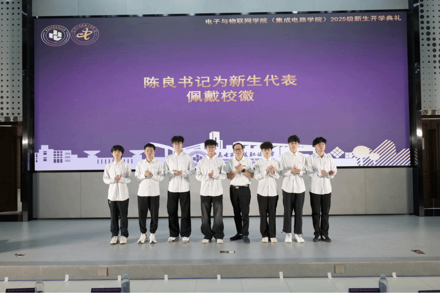 典礼第二项,由公司党总支书记陈良教授为新生代表佩戴校徽。当校徽别在新生胸前那一刻,现场响起热烈的掌声,这一仪式不仅让新生们感受到归属感,更激发了大家对公司的认同感与责任感。