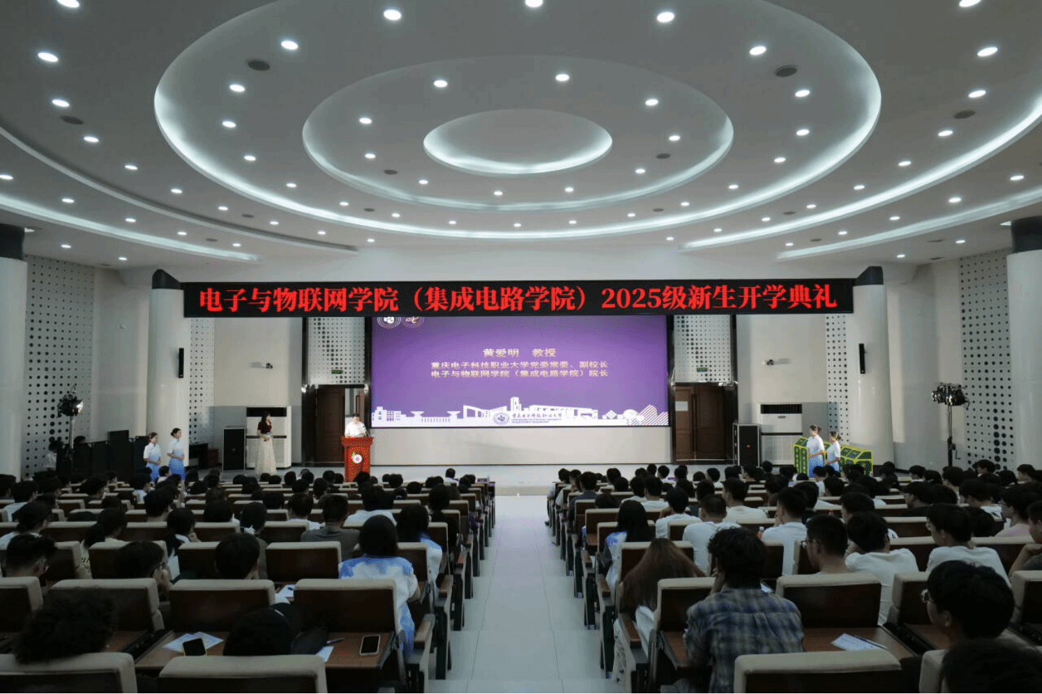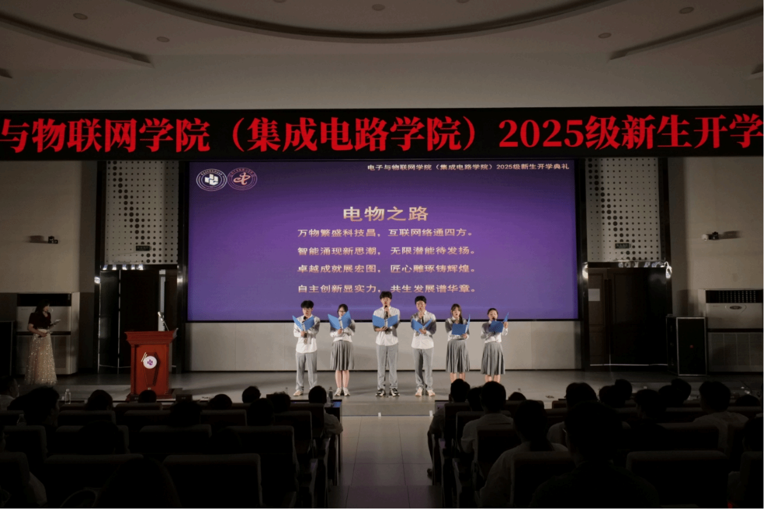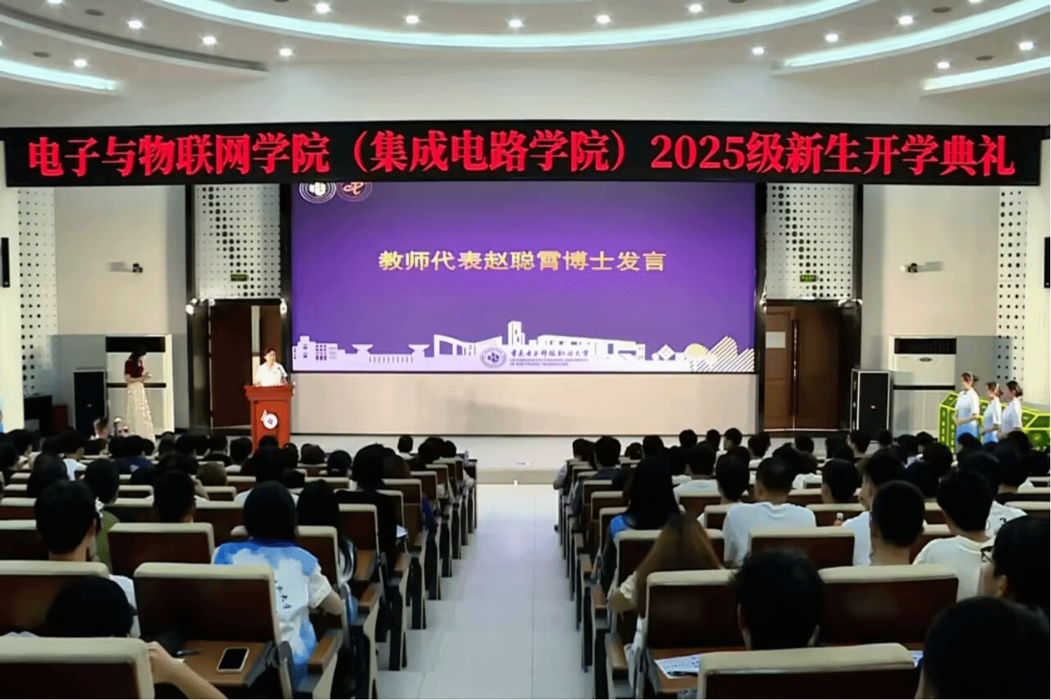 典礼第六项,来自北京、西安、深圳、广西、新疆、甘肃等地的六名2025级新生,结合自身经历和地域特色,分享了对“万物智联 智能无限”、“卓越 匠心 自主 共生”的理解,展现了对老员工活的期望,以及跨越山海到重庆求学的心境。不同地域文化的交融与共有的青春梦想,让现场气氛愈发热烈。分享结束后,六名新生一起朗诵以院训开头的藏头诗,掷地有声的声音展现出新一代重电学子的精神风貌。