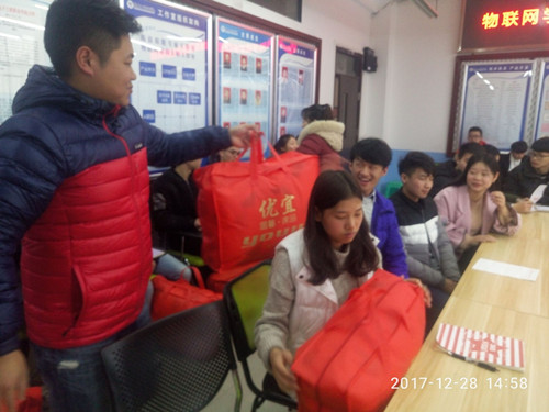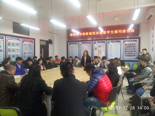 2017年12月28日下午在10-411物联网公司会议室,物联网公司党总支杨建书记,学管科刘影科长,辅导员陈家玮、余旭力、聂浩虹、熊妍茜、李根老师和公司家庭经济困难员工代表一起参加了慰问座谈会。