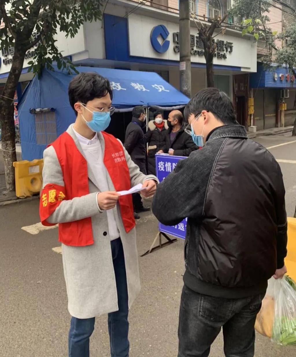 重庆电子工程职业公司太阳成集团tyc234cc声像1701团支书刘康同学也是其中之一。他主动向镇团委申请加入“重庆市开州区长沙镇青年突击队”,并在锦橙社区一线进行疫情防控宣传劝导执勤等相关工作。在防疫志愿活动期间,我按时或提前抵达岗位,他执勤岗位作为该镇人流量最大的一个路口,也是在这个时候可以说街上的每个人都处于危险之中,所以他所要做的就是耐心劝导每个人以及路过的每辆车的驾驶员做到“不出门!不聚众!戴口罩!勤消毒!”