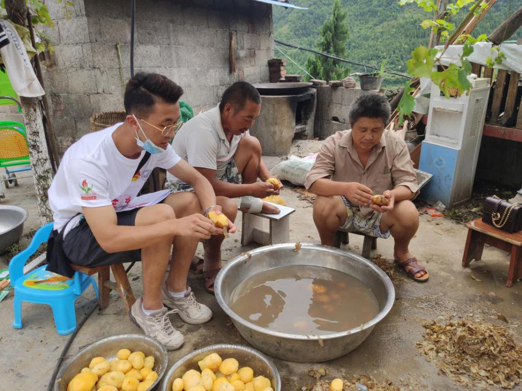 图为小组成员和村民一起制作干洋芋块儿。中国青年网通讯员陈园摄