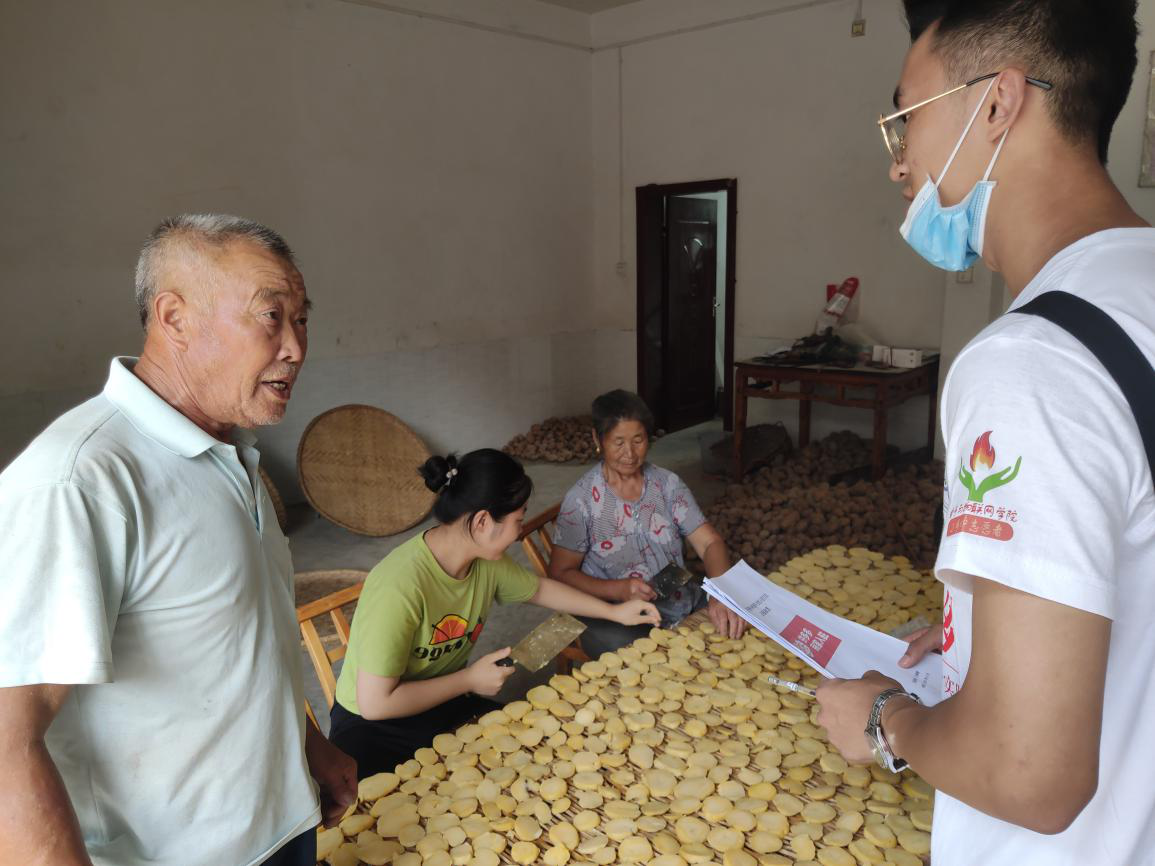 对于这一抹特殊的风景线,小组成员们迅速展开了多方面的了解和调研。在探访一位从事土豆种植加工的村民家中时,队员们了解“干洋芋块儿”的制作流程,亲自动手尝试操作了“干洋芋块”的生产制作流程。从清洗到蒸煮,再到剥皮、切片,然后进行摆放晾晒,经过几天的“日光浴”,就可以放到炕房进行最后的装袋。看似简单的流程,基础是优质的土豆品种和适宜的气候环境,除此之外还需要不断的尝试和摸索,才能将看似普通的土豆制作成色泽金黄、口感劲道的特色农产品。