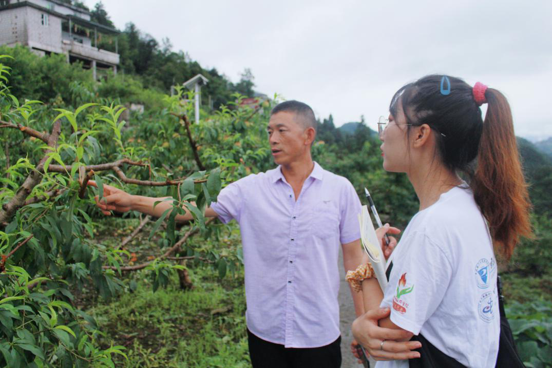 (通讯员 朱艳妮 陶琰歆 熊森浩)7月27日早晨,盛夏时节,万物并秀,“返家乡”社会实践活动小组来到重庆市彭水县鹿角镇乌江村马鬃岭苹果桃基地。脱贫攻坚重在农村,农民脱贫致富关键在于创新农产品产业的特色发展。若想农民从根本上脱贫,那么农业特色产业的发展便成了至关重要的因素之一。近年来,彭水县鹿角镇乌江村倾力打造马鬃岭苹果桃基地,通过发展特色产业在当地取得较好的社会影响,“返家乡”社会实践活动小组本次通过实地观察、采访深入了解马鬃岭苹果桃基地的建设历程和对当地发展带来的经济影响。负责人张先生在了解到小组来访目的后,也热情的带领着队员们参观桃园。