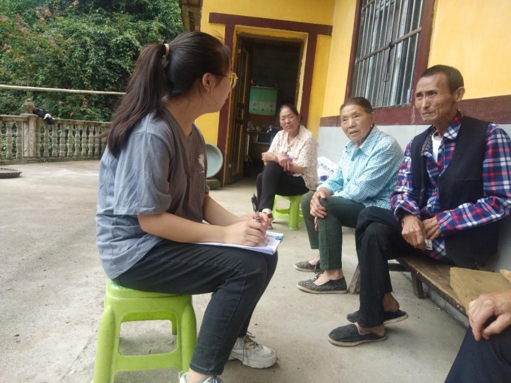 图为队员们正在和当地居民交流接龙村的全新变化。中国青年网通讯员罗晓琼摄