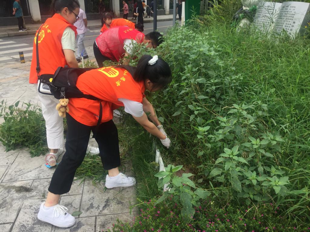 图为返家乡实践小组成员在拔除花坛里的杂草,路过的居民戏称“拔光杂草现熊猫“。中国青年网通讯员 李洋 摄