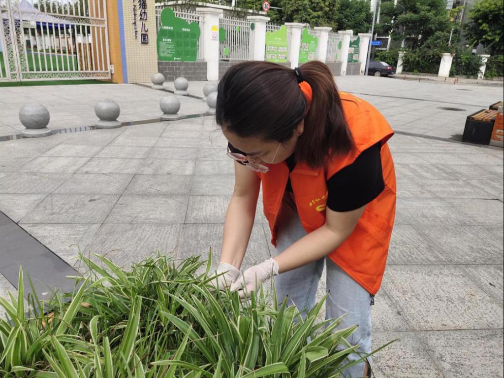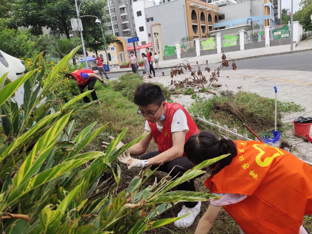 图为返家乡实践小组成员在给刚刚除过杂草的花坛里面的植物整理枝叶,修剪枝干。中国青年网通讯员 李洋 摄