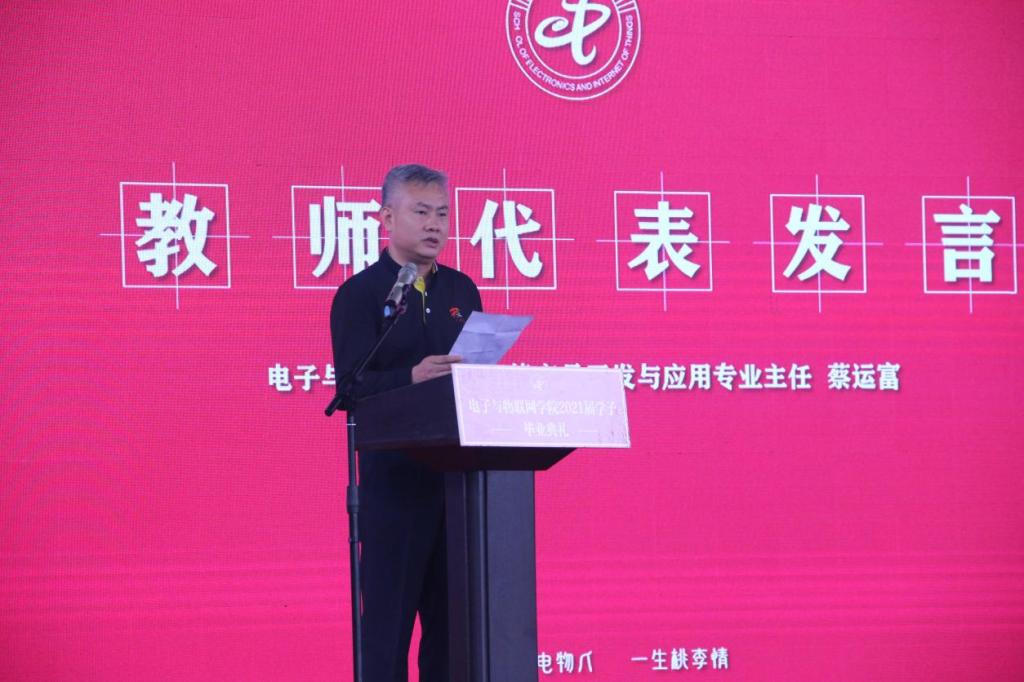 教师代表、公司智能产品开发与应用专业主任蔡运富老师深情回顾了2021届毕业生三年来的学习和成长之路。他送给即将远行的毕业生们几句叮嘱:一是学习学习再学习。知识创造财富、知识改变人生,新的事物将层出不穷,每天都会遇到新的挑战,学习是最好的解决手段,需要一生坚持。二是前进前进再前进。人生的道路不会一帆风顺的,前面一定有坎坷曲折、也一定会有激流险滩,当累了可以歇一歇,歇好了又要精神抖擞的再度前进。蔡运富老师谆谆教诲,肺腑之言,道说出了全体老师的心声。