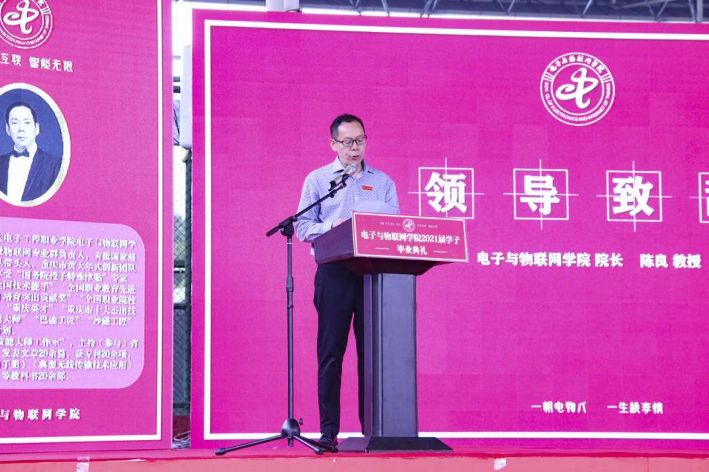 在全场热烈的掌声中,经理陈良教授为本次毕业典礼辞。他代表公司向2021届1225名同学顺利毕业表示热烈的祝贺,向倾心尽力培育同学成才的老师们表示衷心的感谢和崇高的敬意,并与同学们回顾了公司近三年在提质培优、人才培养、文化育人、社会服务等方面取得的发展成就。 陈经理给同学们提出殷切希望:“试玉要烧三日满,辨材须待七年期”,勿忘公司“万物互联,智能无限,卓越匠心,自主共生”的院训,把毕业当入学、把职场当课堂,有板凳要坐十年冷的淡定,有磨剑还需十年功的坚毅,用在校期间的知识积淀去敲开未来的成功之门,用进取的精神去迎接未来未知的挑战,用高超的技能去创造自己的美好人生。