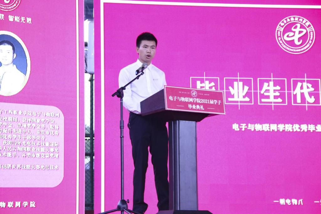 上海第46届世界技能大赛国家队集训选手、第一届中华人民共和国职业技能大赛光电技术项目银牌获得者、优秀毕业生代表李小松同学分享了自己从江西偏远农村站上职业技能竞赛的国赛舞台,步步实现重电梦,技能成才梦的故事,表达了对母校、老师、同学和父母的深深恩情,希望同学们时刻内化公司“卓越、匠心、自主、共生”的理念,牢记着母校“厚德强能,求实创新”的校训,传承“龙翔马跃,博润志远”的人文精神,弘扬“思源致远,员工共进”的员工励志文化,在自己热爱的领域勇攀高峰,逐梦的道路上永不止步。