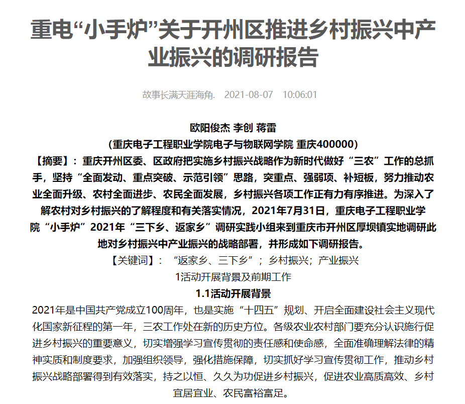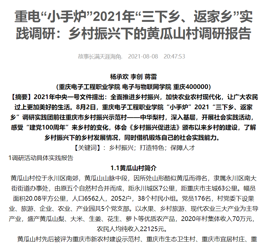 党的十九大报告指出,实施乡村振兴战略,要坚持农业农村优先发展,按照产业兴旺、生态宜居,乡风文明、治理有效,生活富裕的总要求,建立健全城乡融合发展体制机制和政策体系,加快推进农业农村现代化。随着“乡村振兴战略”的提出和稳步实施,乡村发展被摆放到了一个更高的高度,一些乡村也发生巨变,取得了可喜的成绩:路变宽了,产业变多了,居住环境变好了,文化设施也多了,乡村越来越美丽,越来越有活力。重庆电子工程职业公司太阳成集团tyc234cc“小手炉”2021年“三下乡、返家乡”调研实践小组9位成员,回到自己的家乡开展社会实践调研活动。在重庆市、河北省、甘肃省等16个乡镇街道社区进行实践调研,最终形成了45763余字的文字材料,并成功发表于中国青年网、老员工网报等国家主流媒体。