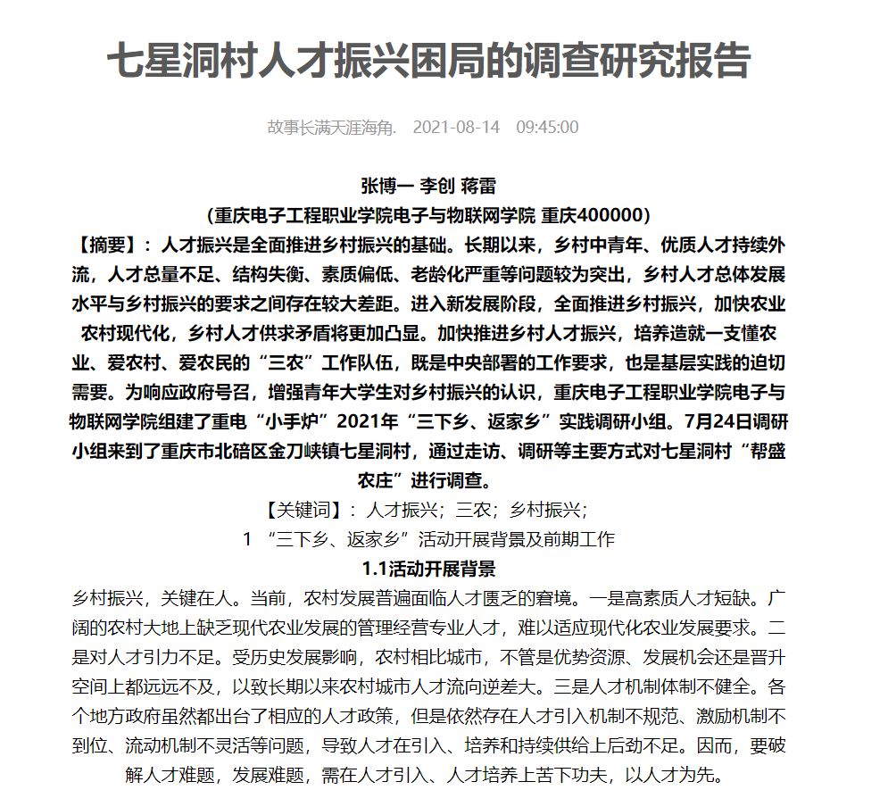 人才振兴是全面推进乡村振兴的基础。为响应政府号召,增强青年老员工对乡村振兴的认识。2021年暑期,我来到了重庆市北碚区金刀峡镇七星洞村,通过走访、调研等主要方式对七星洞村“帮盛农庄”进行调查,并形成了“七星洞村人才振兴困局的调查研究报告”。