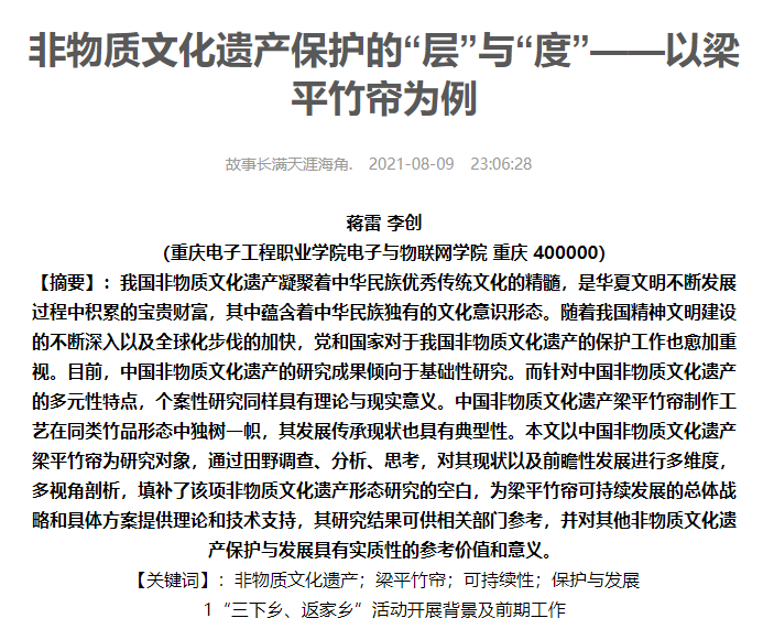 中国非物质文化遗产都是历史的传承下来的珍品,在现代社会发展中,其使用理念,制作工艺,都需要发挥地域文化的优势,将非物质文化遗产用科学有效的方法进行继承。2021年8月7日,我前去拜访了“竹帘”文化的传承人华老师,在与其交流中得知,梁平竹帘以当地盛产的上等慈竹为原料,经过断竹、破竹、划片、启蔑、刨青、取丝、接丝、抽丝、织帘、作画、装裱等八十多道工序精制而成,在干燥环境中悬挂展示,可完好保存上百年。
