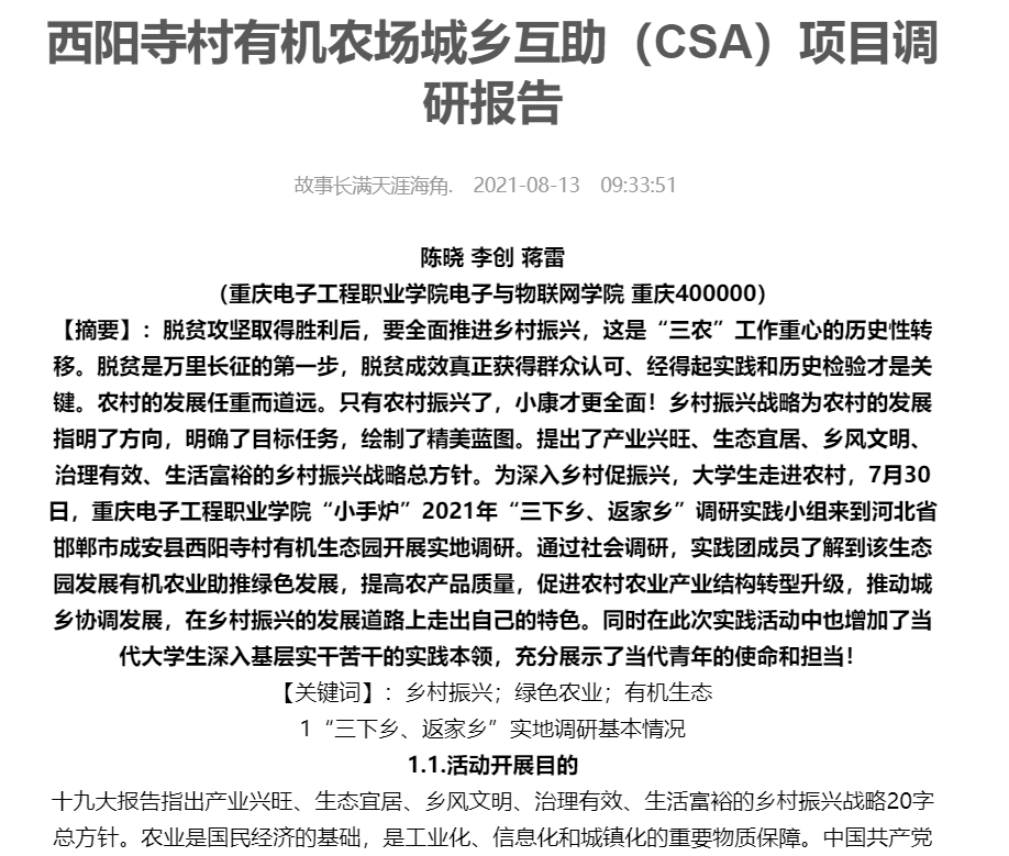 为深入乡村促振兴,老员工走进农村,7月30日,我来到河北省邯郸市成安县西阳寺村有机生态园开展实地调研,并形成调研报告1篇,文字材料1篇。