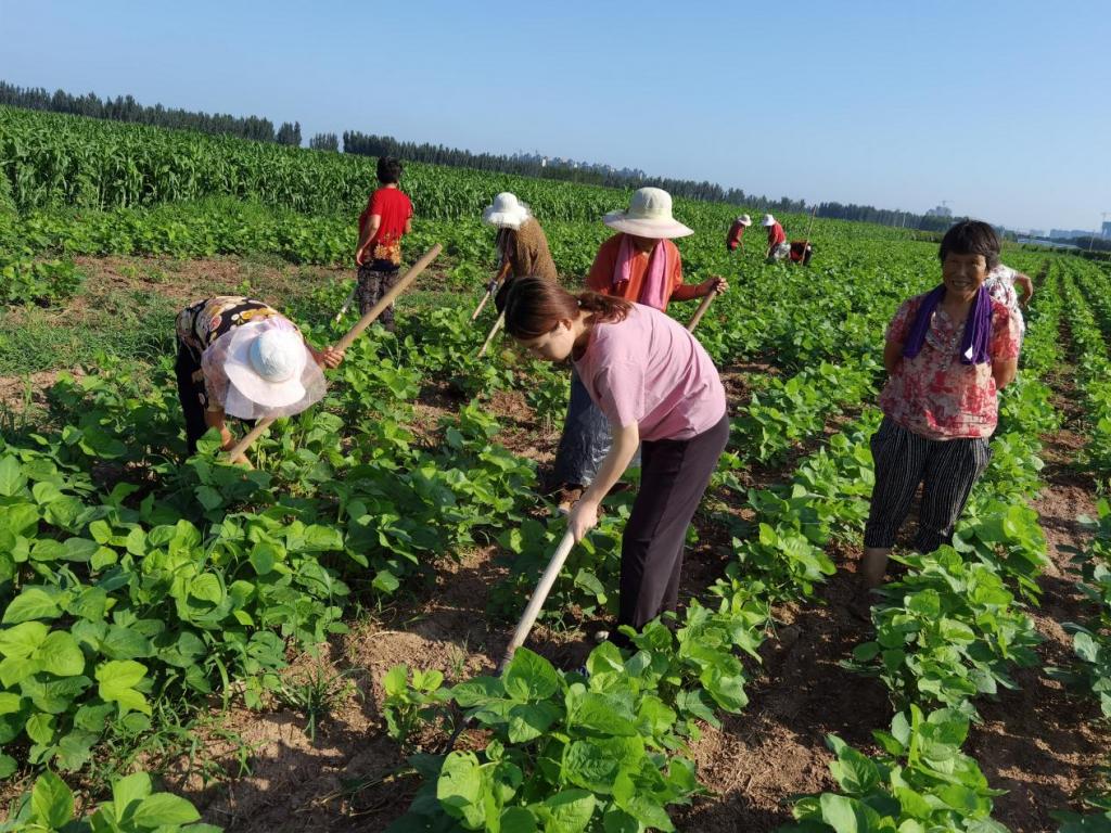 图为实践队员与西阳寺村村民在有机生态园进行人工除草