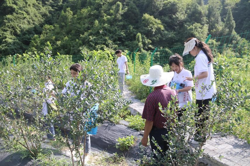 图为队员在驻村第一书记带领下在蓝莓园体验采摘蓝莓