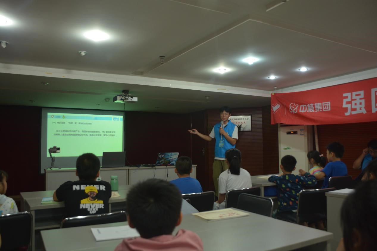 为让更多的孩子了解我国核事业在党领导下从无到有、从弱到强的奋斗历程,同时深入学习我国核工业科技人员在核技术发展创新过程中展现的伟大精神,“万物互联”科普基地、“小手炉”志愿服务队于7月11日在重庆市渝中区嘉西村微型少年宫开展了《小核素的大能量——了解核能》、《走进核工业》、《探秘核电站》三大主题宣讲活动,带领少年宫的小朋友们共忆往昔峥嵘岁月,观今朝无限放风采,感受核电无限魅力。