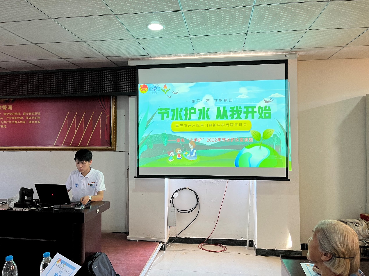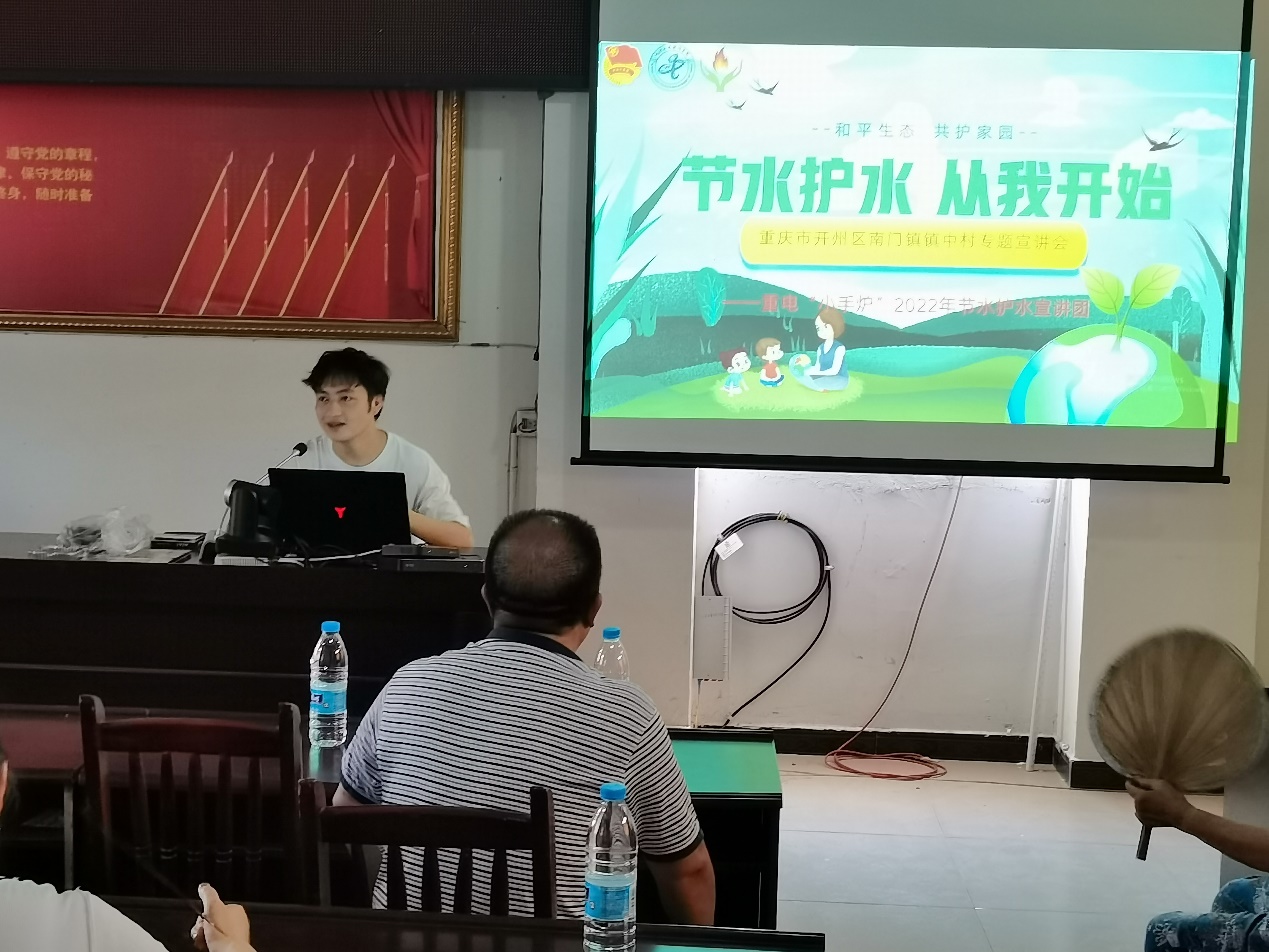 为深学笃用习近平新时代中国特色社会主义思想,深入学习宣传贯彻习近平总书记在庆祝中国共产主义青年团成立100周年大会上的重要讲话精神,引导和帮助广大青年员工上好与现实相结合的“大思政课”,在社会课堂中“受教育、长才干、作贡献”,坚定信念,听党话、跟党走,2022年7月,重庆市委宣传部、市文明办、市教委、市水利局、市乡村振兴局、团市委、市学联共同举办“节水护水宣传调研”老员工社会实践专项行动。重电“小手炉”2022年节水护水宣讲团作为全市19个专项团队之一,于2022年8月18日来到了重庆市开州区南门镇镇中村开展“节水洁水,爱水护水”实践宣讲活动。