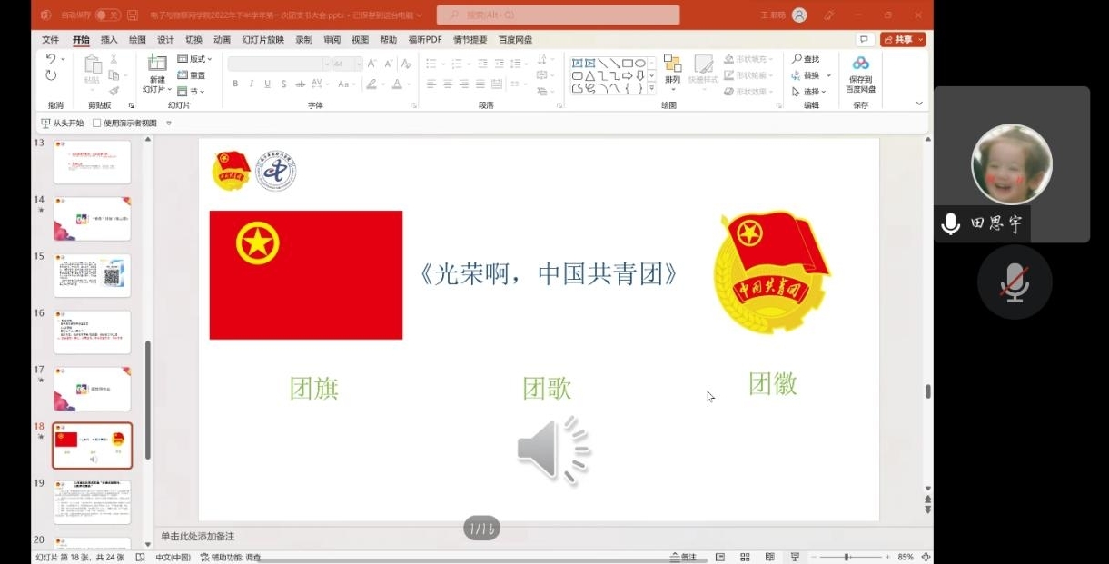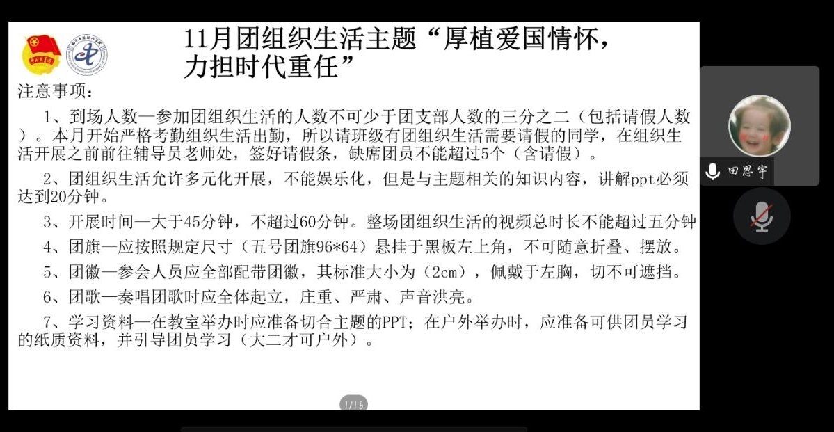 会议第二项,由田思宇同学重点说明了团组织生活的规范性和重要性及团日活动的电子档上传方式,并规范团徽、团旗、团歌的使用。