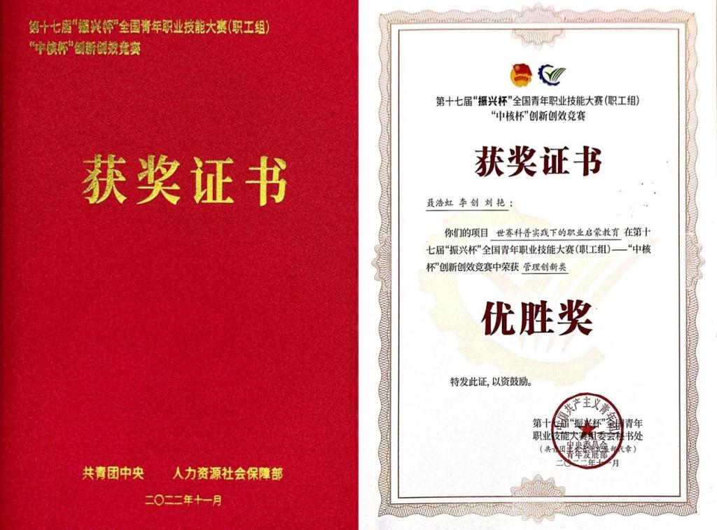 近日,由共青团中央、人力资源社会保障部联合举办的第十七届“振兴杯”全国青年职业技能大赛(职工组)——“中核杯”创新创效竞赛全国决赛落下帷幕。本次大赛聚焦关键领域、重点行业,设置研发创新类、技术革新类、管理创新类三个竞赛方向,涵盖机械与控制、信息技术、生命科学、能源化工、社会服务等领域,是“振兴杯”首次面向青年职工举办的创新创效竞赛。大赛以线上线下相结合的方式进行,共吸引来自全国29个省份、7个行业系统的261个项目。经过层层选拔,公司团总支书记聂浩虹老师、辅导员李创老师、辅导员刘艳老师共同完成的项目——《世赛科普实践下的职业启蒙教育》荣获管理创新类方向“全国优胜奖”。