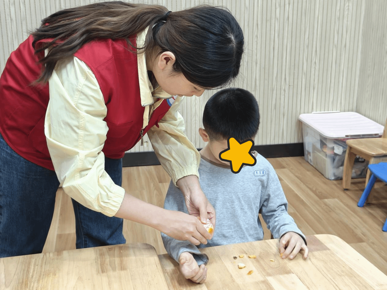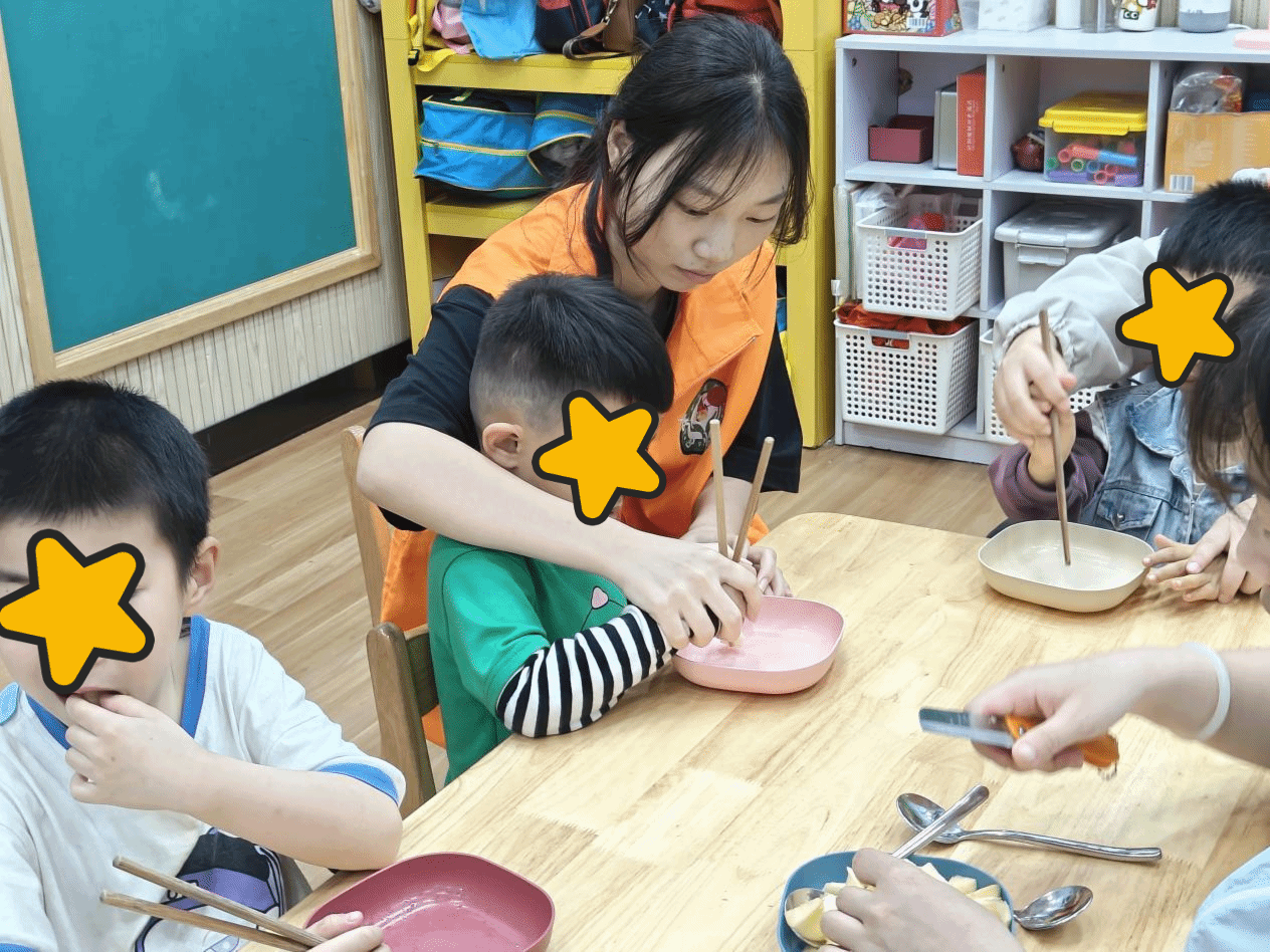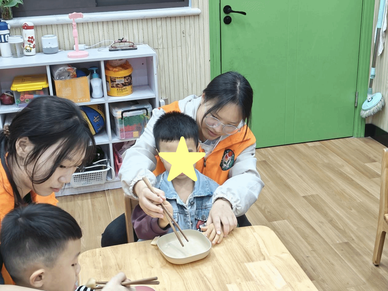 其中有两个班级,四位女生两两一组耐心地教授孩子们生活技能。其中一组详细地演示和讲解了如何正确使用筷子夹取水果,从握筷的姿势到夹取的动作,都一一进行了指导。在志愿者的鼓励和帮助下,“星儿”们逐渐掌握了这项技能。