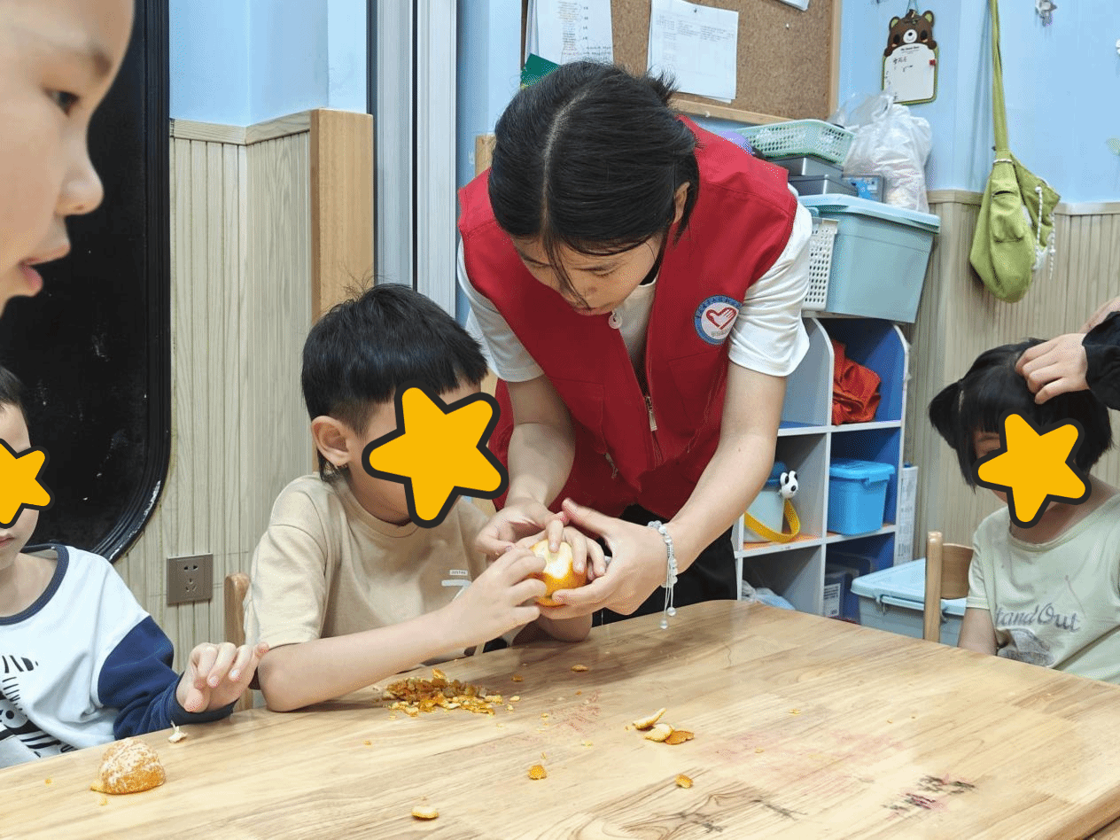 另外一组教授孩子们如何剥橙子皮。她们将橙子分发给孩子们,并一步步演示剥皮的过程。孩子们聚精会神地学习着,然后模仿着志愿者的动作,小心翼翼地剥下了橙子皮。