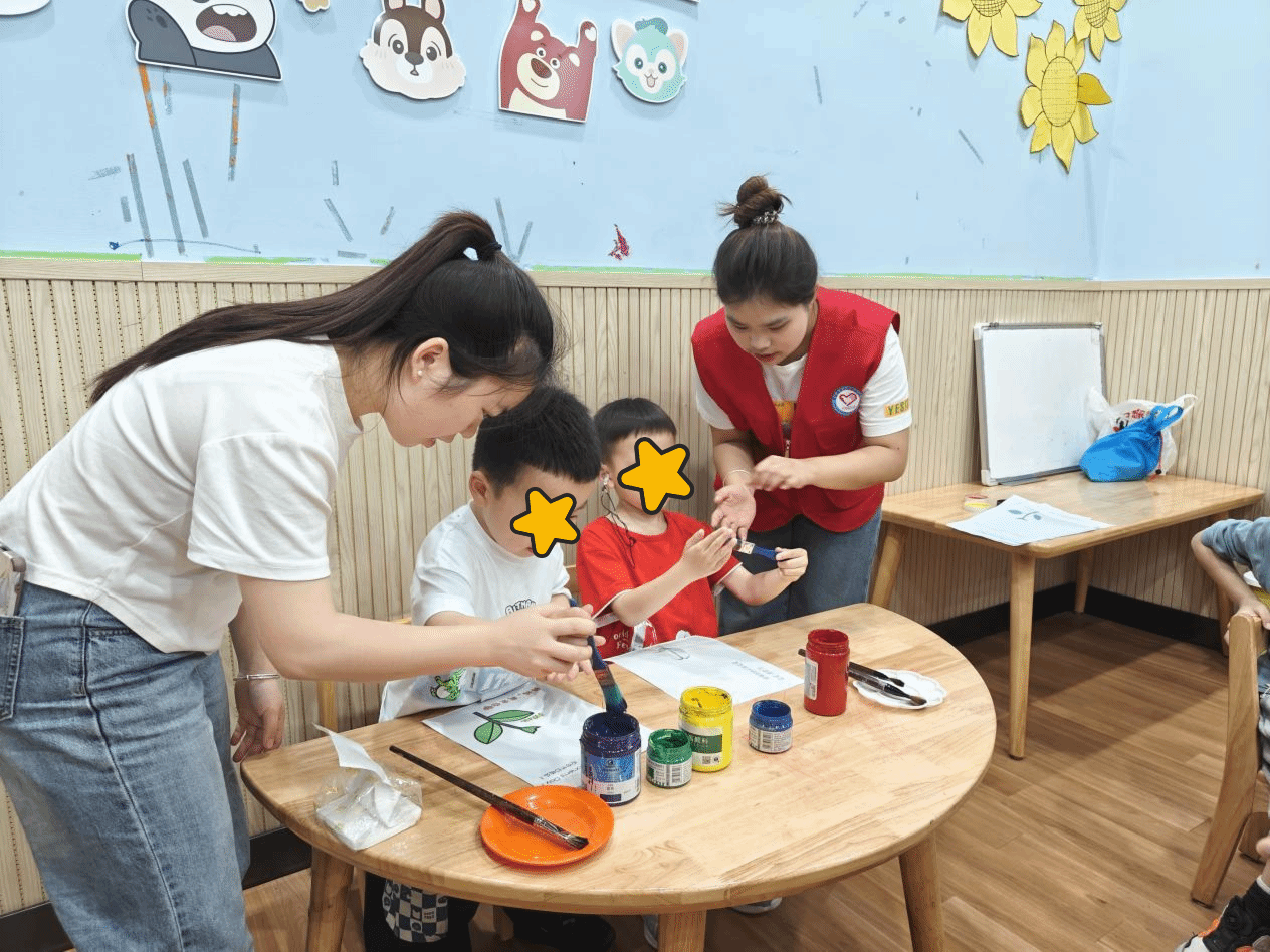 此外,志愿者在教室里协助老师教“星儿”们为即将到来的母亲节准备礼物。孩子们将颜料涂在手上,将手印在纸上,绘画出一朵蕴含着对母亲的感激与祝福的花朵。