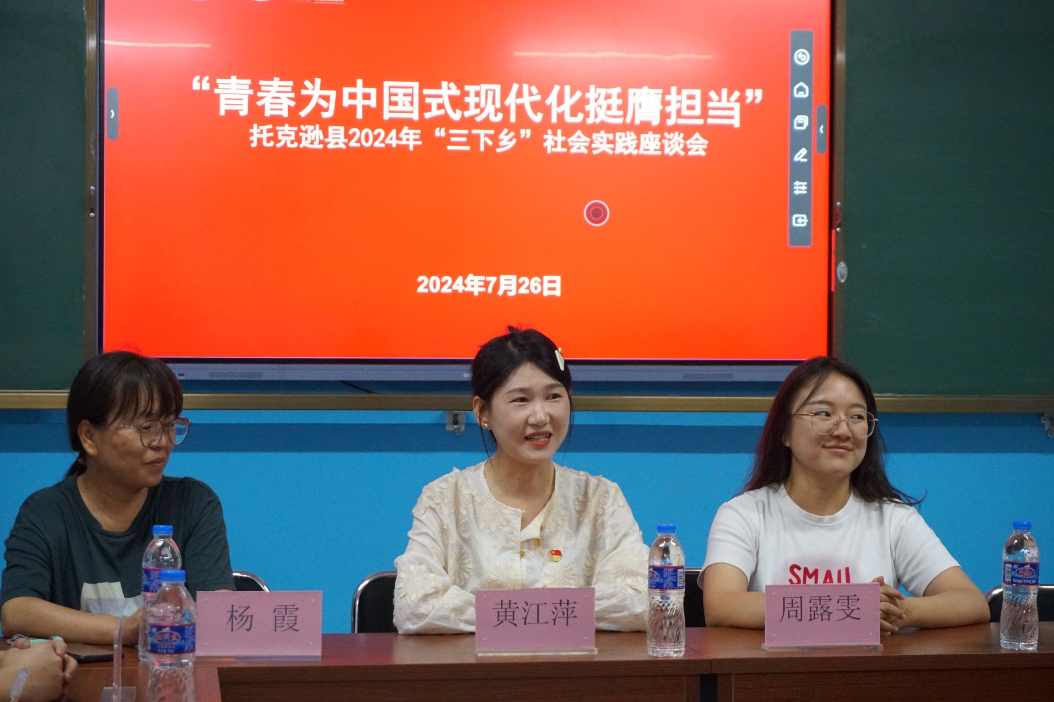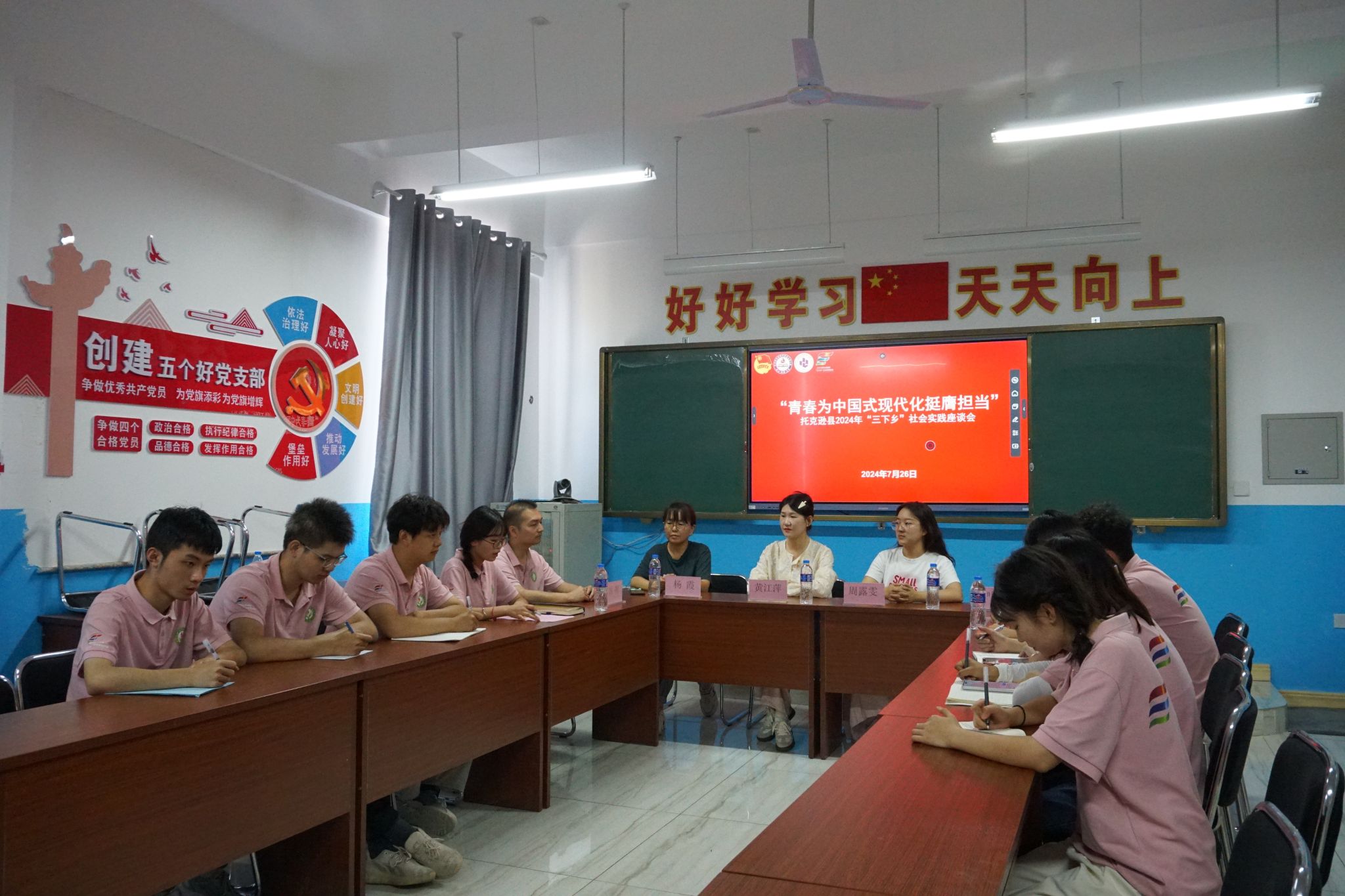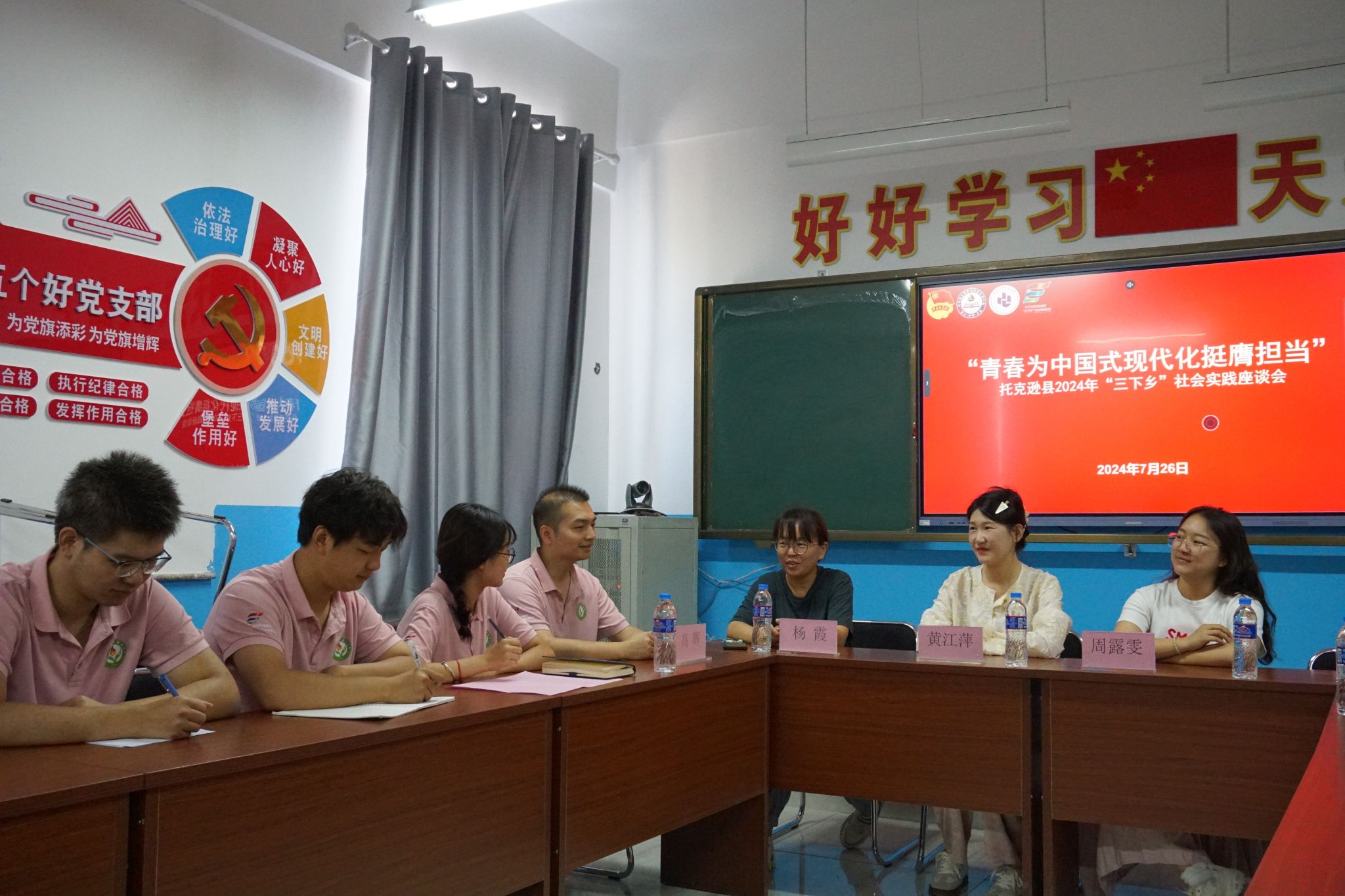 2024年7月26日,托克逊团县委书记黄江萍一行来到博斯坦镇新高潮公司看望慰问重电“小手炉”志愿服务队的实践队员们,并与志愿服务队的志愿者们开展了面对面的座谈交流会。团县委挂职副书记周露雯、新高潮公司党支部书记杨霞、太阳成集团tyc234cc思想政治辅导员陶琰歆、专任教师高辉参会。