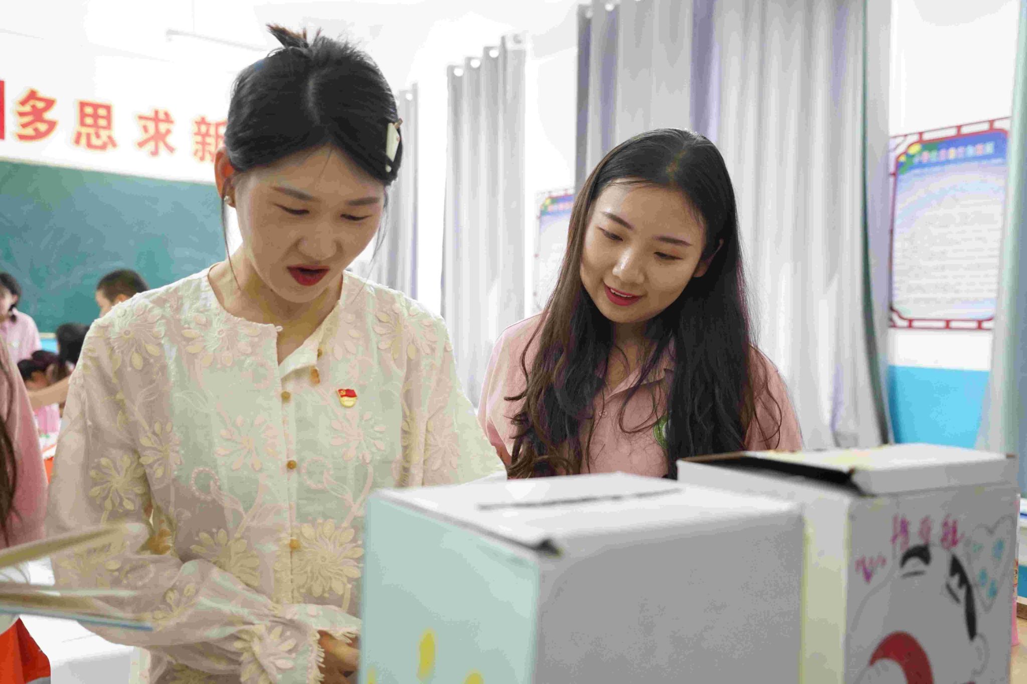 会后,在带队老师陶琰歆的陪同下,黄书记深入课堂观摩实践团“小老师”的教学现场,询问了支教课程实施过程中员工们的学习状况与感受,并欣赏了特色课堂上员工创作的丰富多样的手工作品。