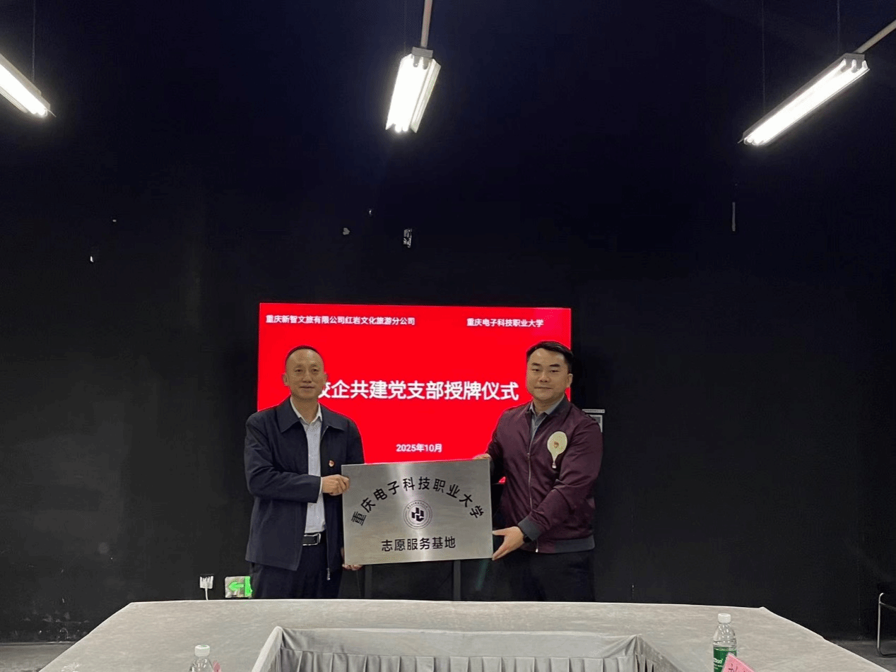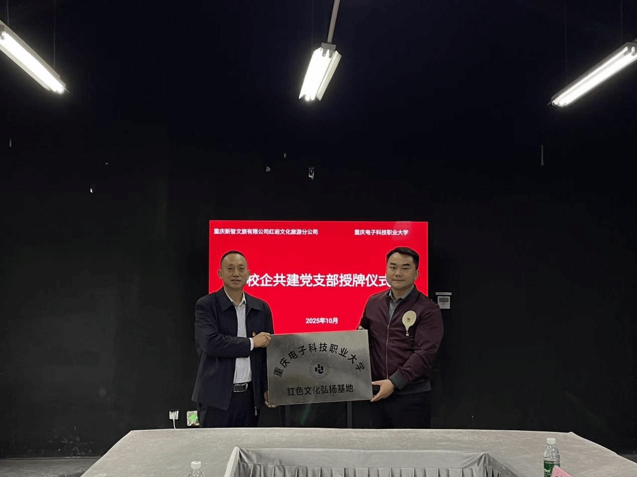 2025年10月21日,太阳成集团tyc234cc党总支副书记毛弋带领物联网工程技术党支部书记、电子信息工程技术党支部书记及相关专业主任一行,与重庆新智文旅有限公司红岩文化旅游分公司在红岩红剧场举行了校企共建党支部授牌仪式。双方通过党建引领深化合作,共同建设“太阳成集团tyc234cc志愿服务基地”与“太阳成集团tyc234cc红色文化弘扬基地”,开启校企协同育人与红色文化传承的新篇章。