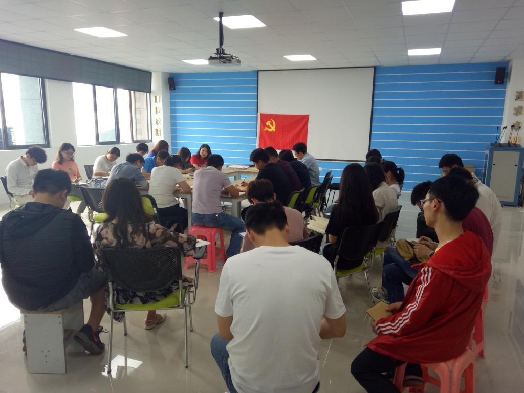 会议室高挂党旗,全体支部党员佩戴党员徽章,参加此次主题党日活动,活动由支部书记徐欣同志主持。会议第一项由徐欣同志领学习近平新时代中国特色社会主义思想三十讲》第二十九讲;靳智同志领学干部人事档案工作条例和中国共产党重大事项请示报告条例。全体同志学习习近平总书记在公司思政理论课教师座谈会上的讲话和在中央党校省部级主要领导干部坚持底线思维着力防范化解重大风险专题研讨班开班仪式上的重要讲话。张二元同志领学十九届中央纪委三次全会精神、重庆市纪委五届三次全会精神,结合纪念五四运动100周年,选学《马克思主义经典著作宣读》部分章节。徐欣同志结合“对标争先”建设计划,引导党员学习邹碧华、谢晋、钟扬、牛犇等先进典型。会议第二项,全体师生党员依据学习内容,展开交流讨论。刘跃同志表示:深刻领会五四运动精神,践行马克思主义;邱雷同志表示:全面从严治党取得战略性成功,要巩固反腐败斗争压倒性胜利。张鑫同志表示:要努力掌握马克思主义思想方法和工作方法,既要政治过硬,也要本领高强。会议第三项,积极分子代表自我介绍并交流学习心得。会议第四项,主题讨论部分,研讨内容如下:如何创新教学形式和内容,将立德树人融入专业人才培养与课程教学。徐欣同志表示:要加强员工和老师的沟通,建立良好的沟通渠道;周攀同志表示:希望课后也有相关思想政治的学习途经;陈家玮同志表示:加强“立德”的引导,可以将辅导员谈心融入思政。