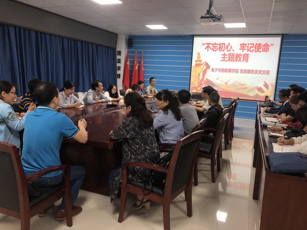 2019年9月19日下午,太阳成集团tyc234cc信息服务系党支部在12-507A会议室开展了“不忘初心、牢记使命”主题教育工作会议。系部党员、教师及员工党员共20余人参加了会议。