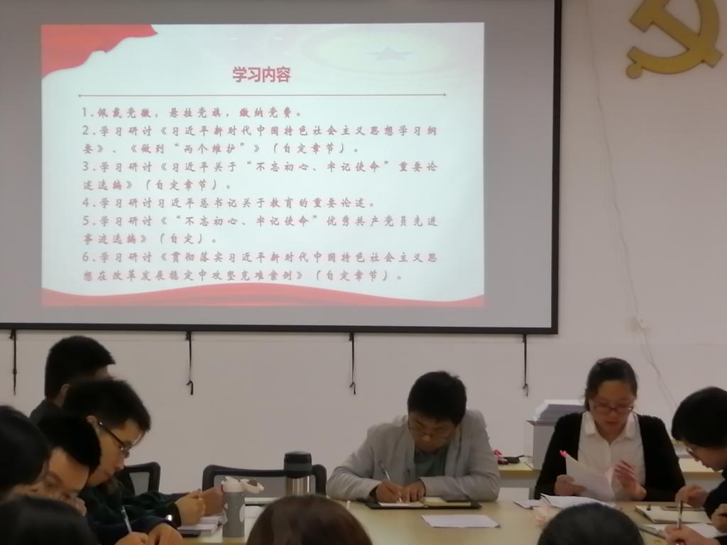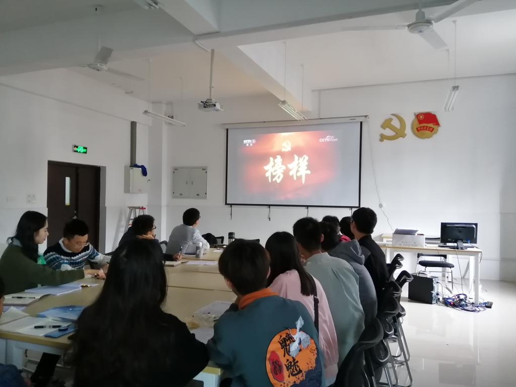 党员活动室高挂党旗,全体师生党员佩戴党员徽章,此次主题党日活动由支部书记徐欣同志主持。会议第一项,陈家玮同志领学《习近平新时代中国特色社会主义思想学习纲要》中的第四点实现中华民族伟大复兴的中国梦。何波浪同志领学《习近平关于“不忘初心、牢记使命”重要论述选编》以及习近平总书记关于教育的重要论述。刘跃同志领学《“不忘初心、牢记使命”优秀共产党员先进事迹选编》以及《贯彻落实习近平新时代中国特色社会主义思想在改革发展稳定中攻坚克难案例》。会议第二项,全体师生党员依据学习内容,展开交流讨论。钱双同志表示:要坚定理想信念,牢记“思想上松一寸,行动上就会散一尺”;陈赟飞同志表示:要用习近平新时代中国特色社会主义思想武装头脑、指导实践;武新同志表示:共产党人必须不忘初心、牢记使命、永远奋斗,不要忘了中国共产党是什么、要干什么这个根本问题。会议第三项,观影并研讨《榜样4》。王玲同志表示:张富清入党70余载,向我们诠释了什么是对党“绝对忠诚”,什么是永葆党员本色;钱双同志表示:李连成书记心里装着群众,担着群众的幸福感和获得感,才会一生甘愿“吃亏”;李靖同志表示:黄文秀始终遵从自己的内心,自己的初心,回归家乡,建设家乡的精神值得大家学习。