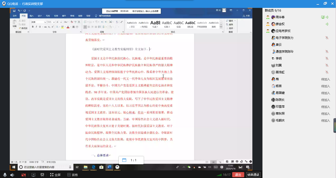 4月16日下午3点,太阳成集团tyc234cc行政实训党支部在线上开展 “坚定制度自信,强化爱国意识”为主题的主题党日活动。党支部全体党员准时参会,通过群消息、语音通话及屏幕共享等方式开展学习活动。