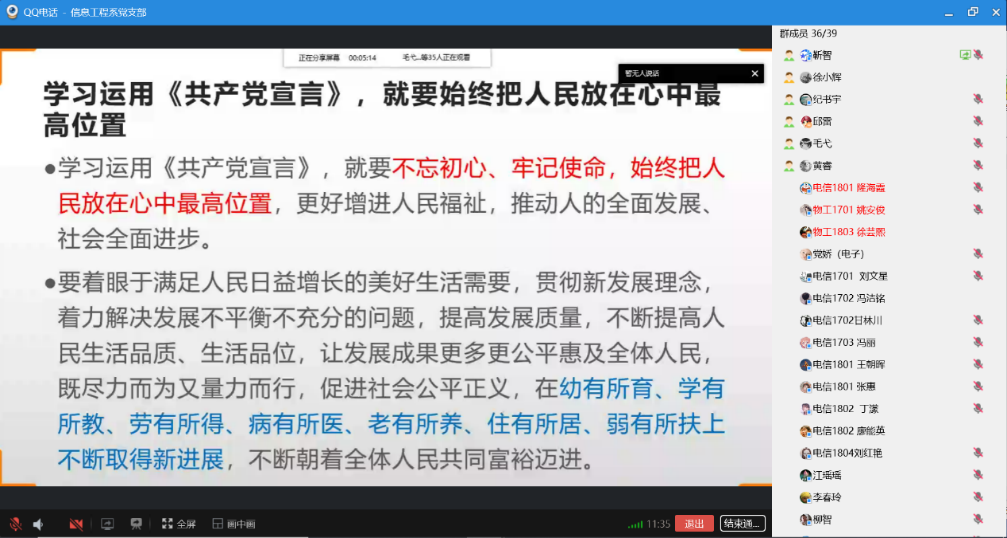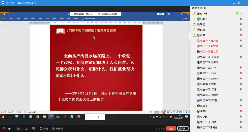 8月27日,信息工程系党支部通过QQ线上视频会议形式开展题为“新时代 新思想”的8月主题党日学习。本次活动由支部书记徐小辉同志主持,公司党总支副书记毛弋同志及支部全体党员、入党积极分子参加学习。