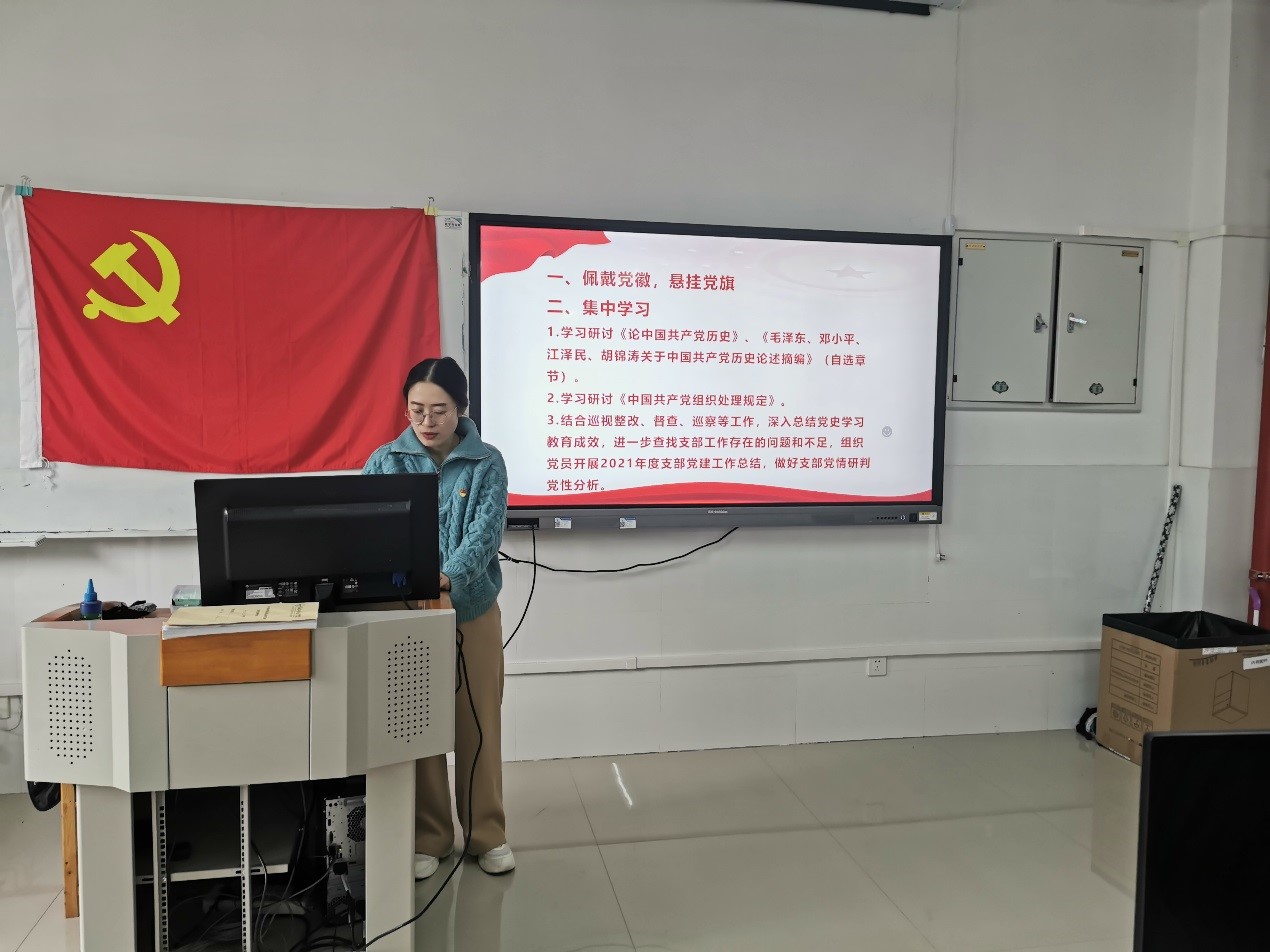 徐奡澍同志组织党员开展2021年度支部党建工作总结,进一步查找支部工作存在的问题和不足。开展支部党情研判与党性分析。并对2022年的支部工作做了部署和安排:要求全体师生党员务必加强党史学习,深入学习习近平新时代中国特色社会主义思想,贯彻落实立德树人的教育理论,在工作中充分发挥党员的先锋模范作用,助力公司发展再上新台阶。