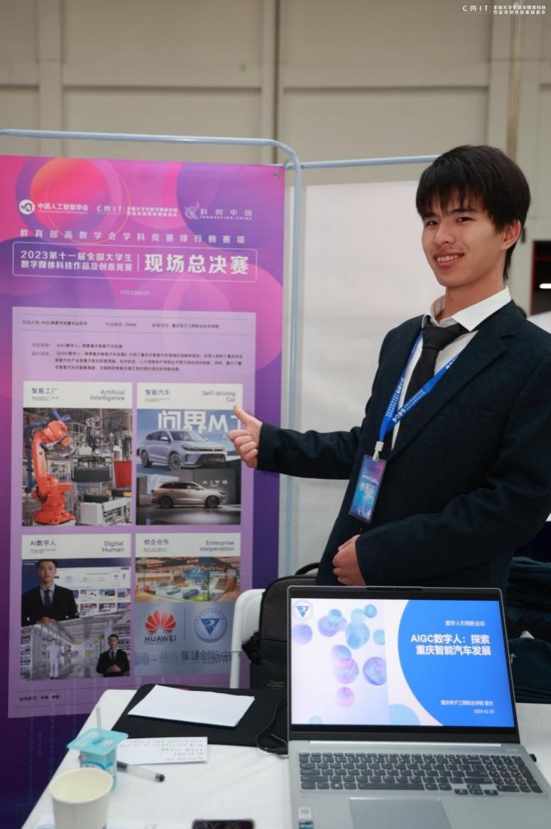 AIGC类数字创意作品赛项要求参赛团队利用诸如:ChatGPT、Stable Diffusion模型、文心大模型、混元大模型、通义大模型和盘古大模型等国内AIGC平台等智能化创作工具进行创作,体现作品的创意性、科技感和智能化。本次参赛作品为《AIGC数字人:探索重庆智能汽车发展》,介绍了重庆在智能汽车领域的成就和地位,并深入剖析了重庆市在智能汽车产业发展方面的政策措施、技术研发、人才培养和产学研合作等方面的成功经验。同时还展示了重庆智能汽车在智能驾驶、车联网和智能交通方面的领先地位和创新成果。总决赛现场评委给予了高度评价。