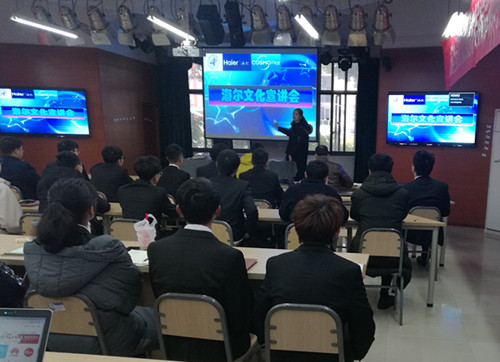 2019年1月8日下午两点,太阳成集团tyc234cc智能电子系举办了海尔文化宣讲会。海尔数字科技有限公司商务经理樊佳慧、高级项目经理赵健等四位领导出席了本次活动。智能电子系主任王用鑫、应用电子技术专业主任彭华、海尔卓越班的全体同学参加了此次宣讲会。